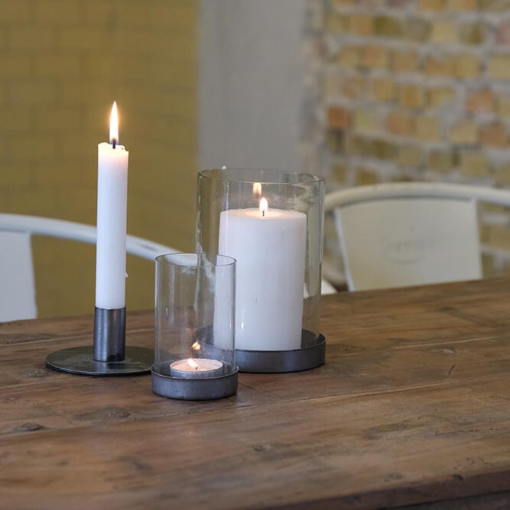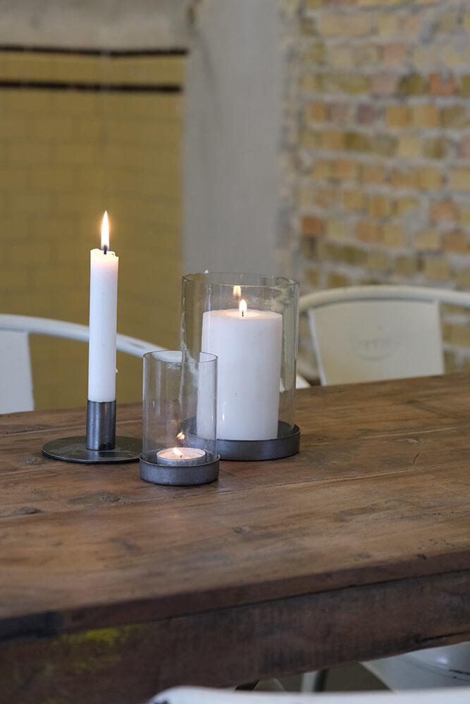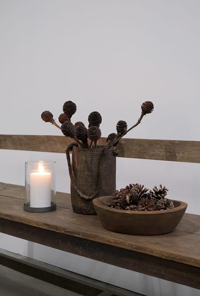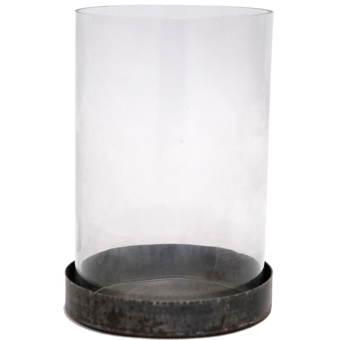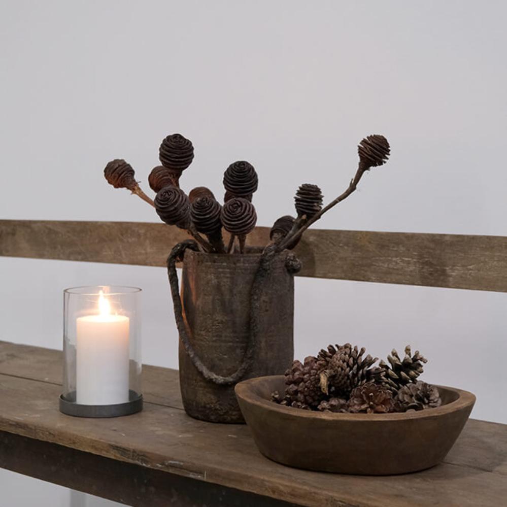 Hurricane stage i et enkelt rustikt design - skålen er i jern med rustpatina. Brug hurricanen stagen med et fyrfadslys eller et lille bloklys og skab hygge og varme. Stagen kan også bruges til pynt med kogler eller andet grønt/pynt.