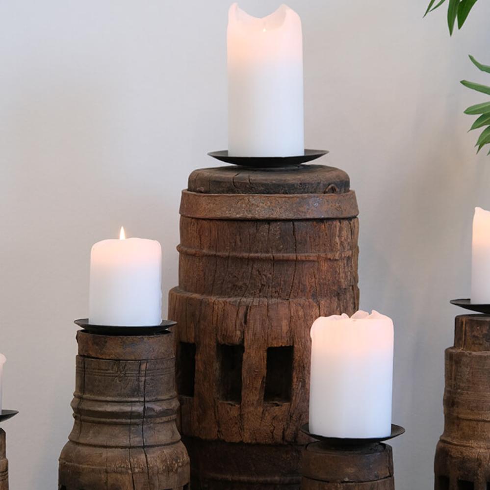 Lys spreder varme, stemning og hygge som intet andet. Derfor fortjener dine lys også en helt særlig lysestage, som komplimenterer og forstærker stemningen. Med disse lysestager lavet af hjulnavene fra gamle træhjul, får dine lys en rustik og charmerende platform, hvorfra de kan sprede varme og hygge til hele rummet. Lysestagerne er upcyclet fra forskellige træhjul og kan derfor variere i størrelse: Højde 25-40 cm. Diameter 14-20 cm.