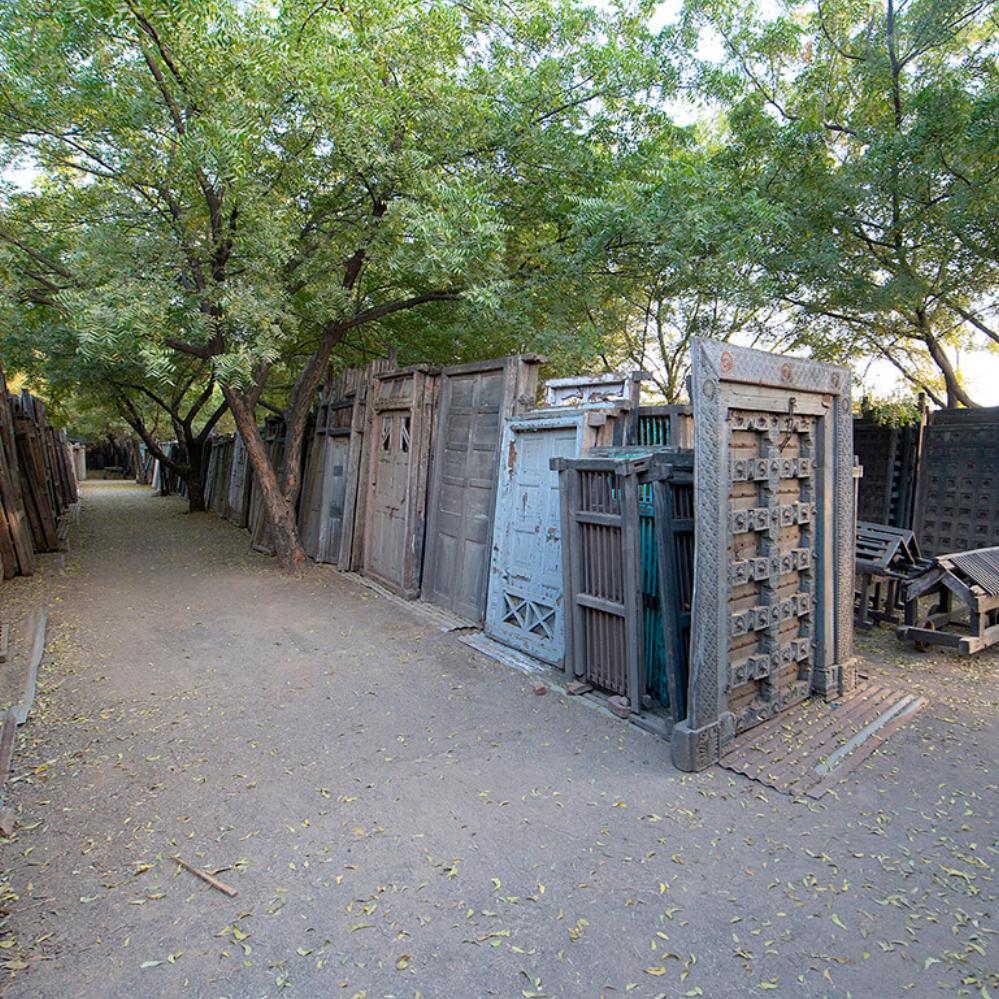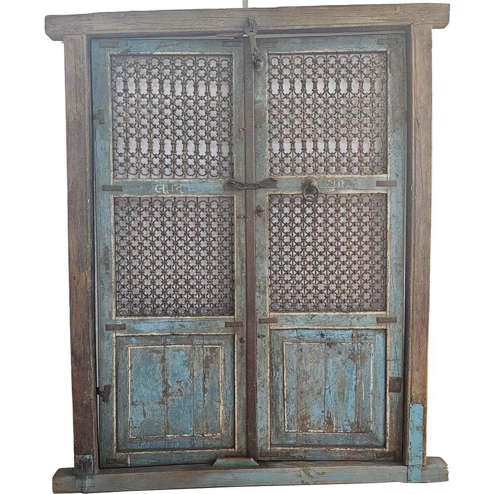 Denne smukke gamle dør oser af karakter og historie. Dens træramme i patineret blå og naturlige nuancer er kombineret med et detaljeret jerngitter, der giver døren et særligt udtryk. Gitteret tilføjer et industrielt touch, mens træets slidte finish skaber varme og charme. Denne dør er funktionel og et blikfang i sig selv, perfekt som vægdekoration, en dekorativ opdeling eller som en del af et større projekt med genbrugte materialer. En gammel trædør, der virkelig fortæller sin egen historie.