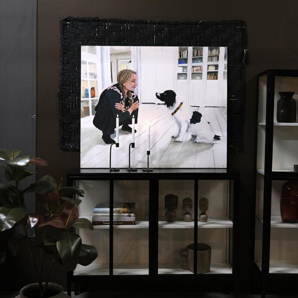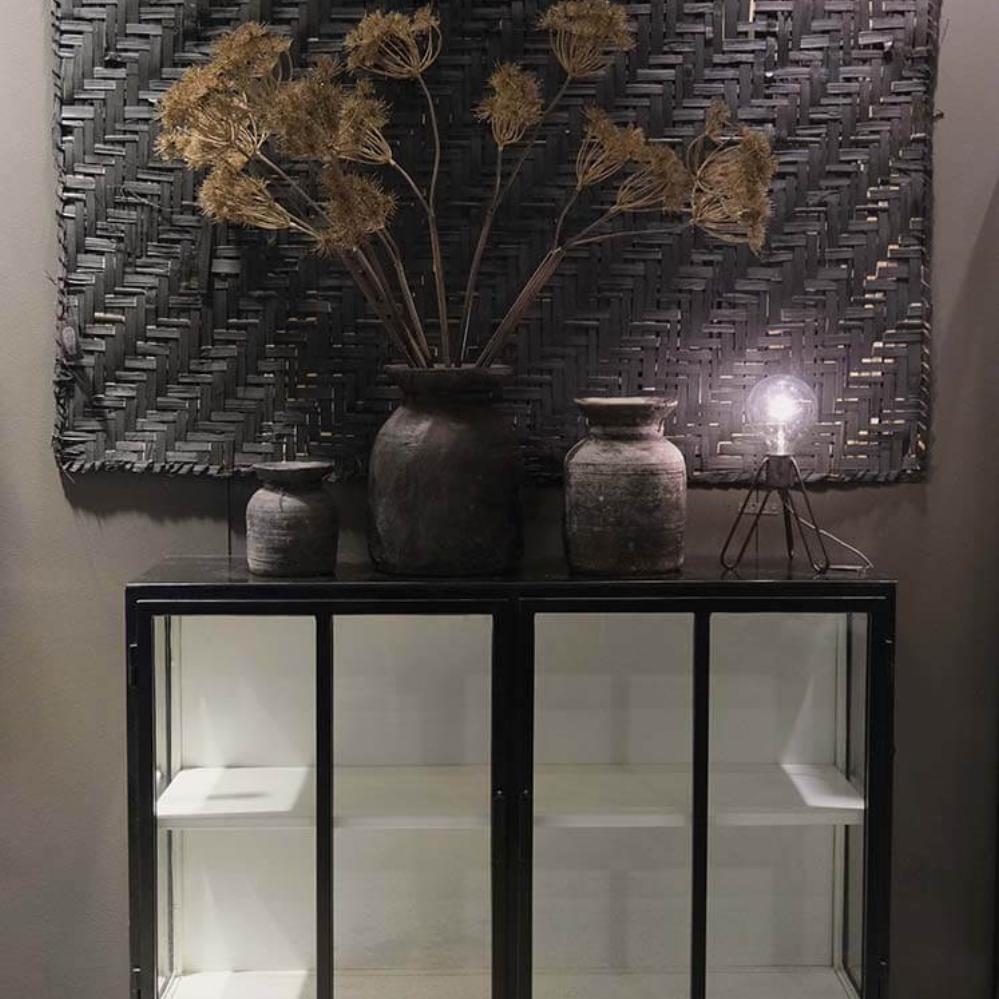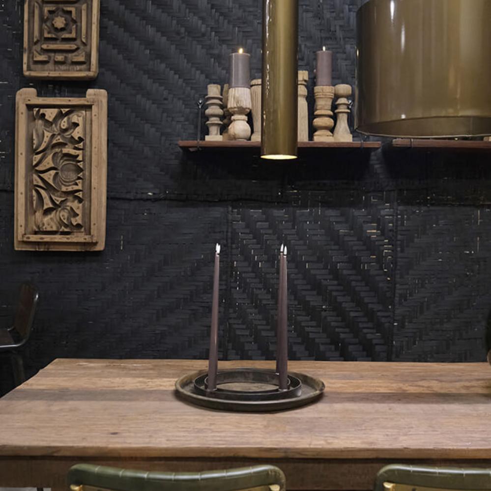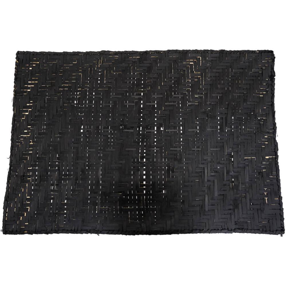 Skøn vægdekoration lavet af sammenflettede, sortmalede palmeblade. Vægdekorationen er et godt bud på det perfekt uperfekte med dens uensartede tykkelse på strimlerne og det ikke så stringente flet. Tag dog ikke fejl af, at der ligger et stort stykke håndarbejde bag den smukke mørke vægdekoration. Ikke to af måtterne vil være helt ens.