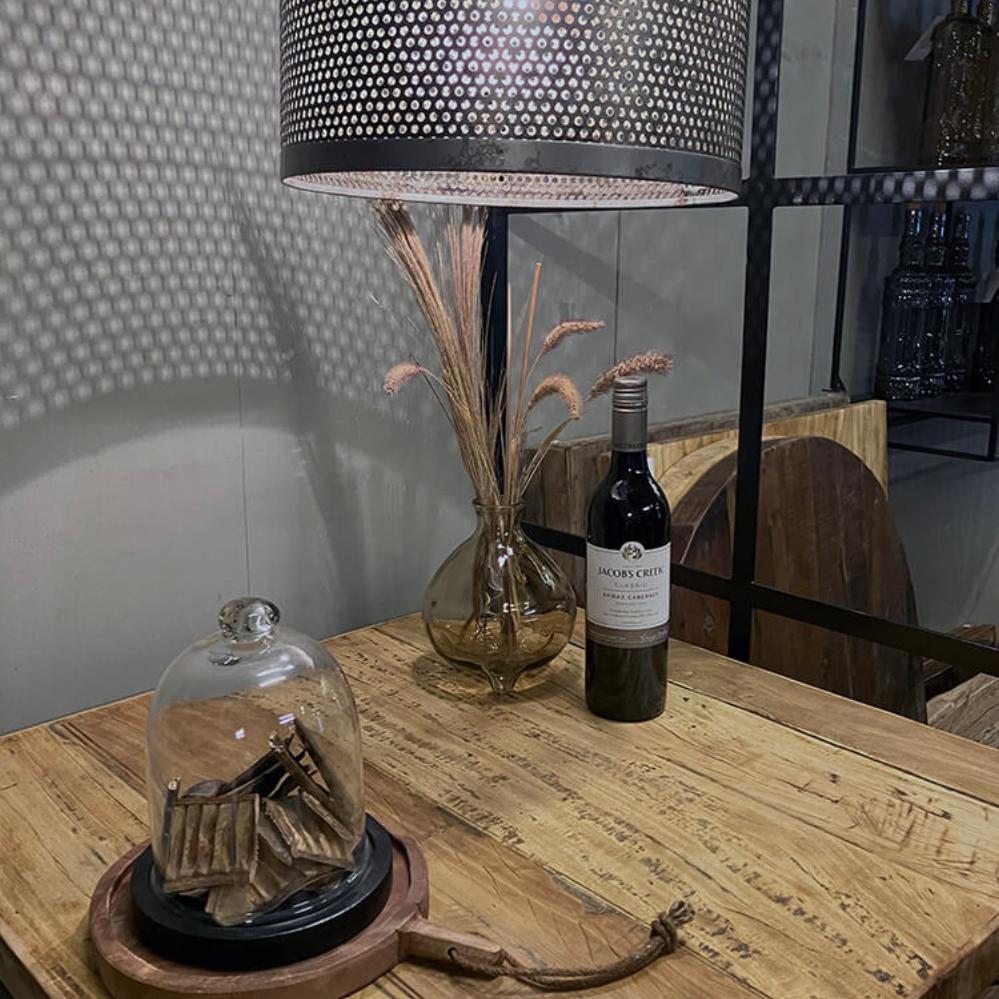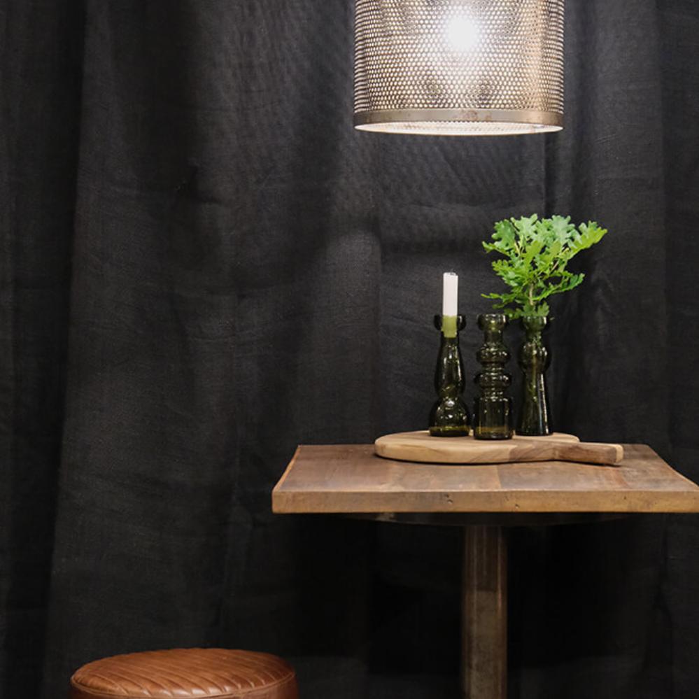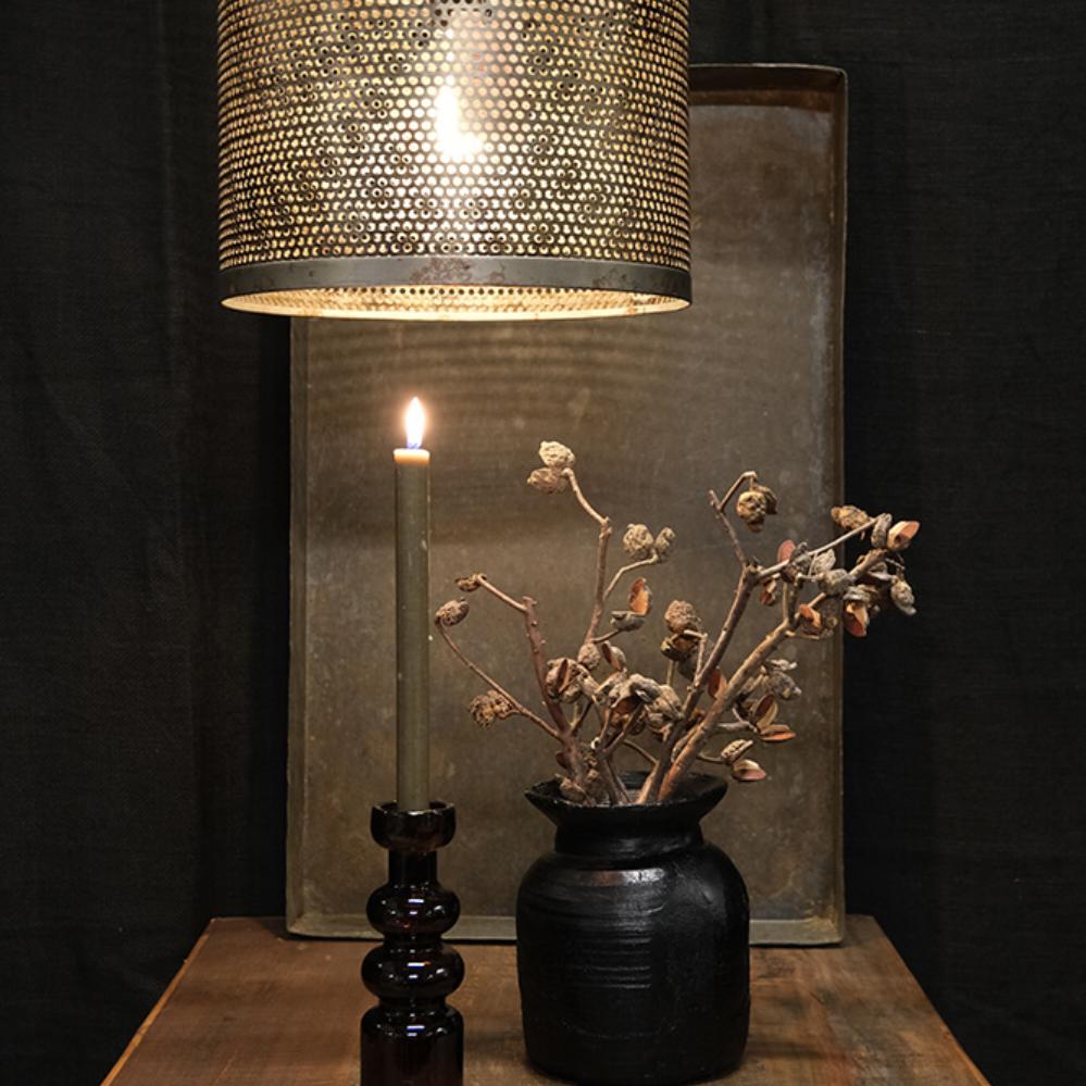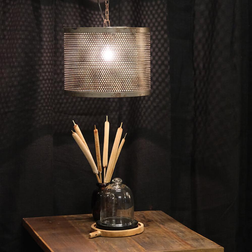 Kelly tager pusten fra de fleste. Den rustikke jernlampes patinerede og perforerede skærm, spreder en rå og industriel stemning, uanset hvilket rum den lyser op. En jernkæde er fastgjort til den patinerede lampeskærm og baldakin, hvilket tilfører lampen et yderligere rustikt touch.