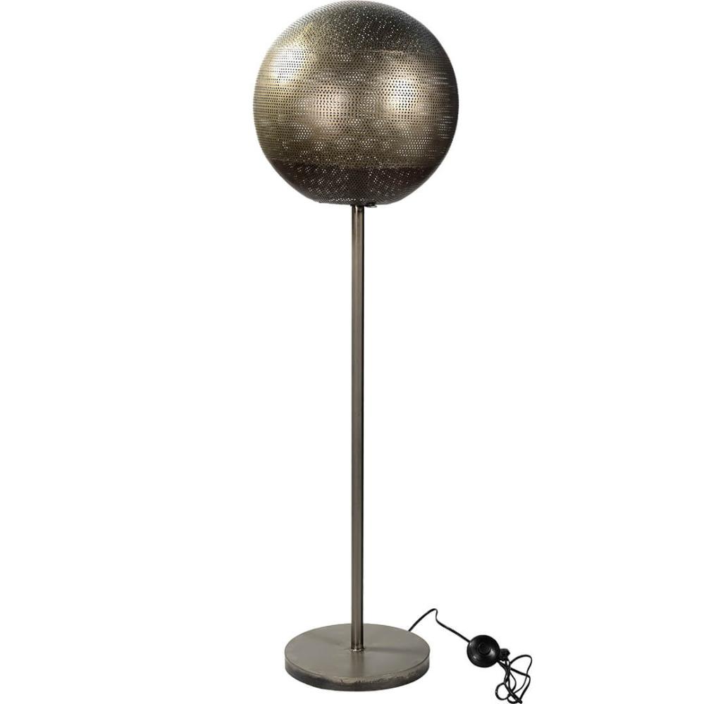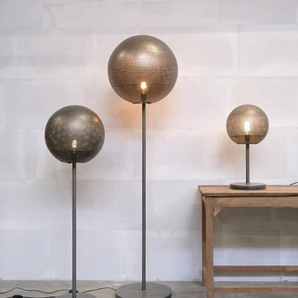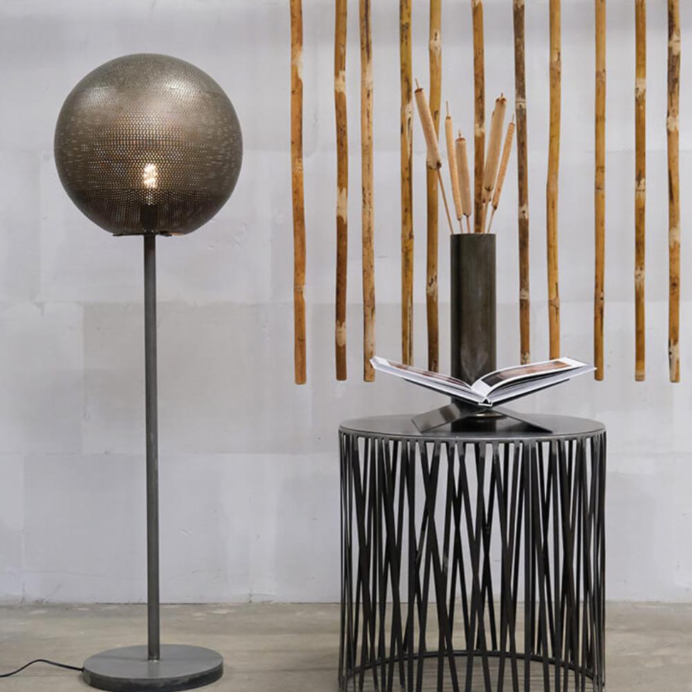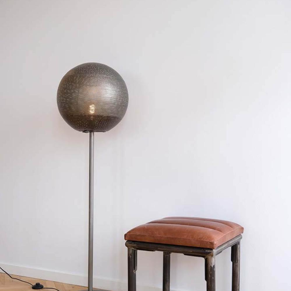 Moonlight gulvlampen i medium størrelse er det perfekte mix af maskulinitet og stemningsfuld belysning. Lampen er lavet i jern og står stabilt på en rund fod med en diameter på 30 cm. En slank stamme løfter den karakteristiske runde skærm, som er lavet i perforeret jern, og det er netop de mange små huller i skærmen, der skaber det magiske lysspil, når lampen tændes. Et sikkert valg til både klassiske, enkle og industrielle indretninger. Moonlight lampen findes i tre størrelser, så du kan mikse og matche efter behov.