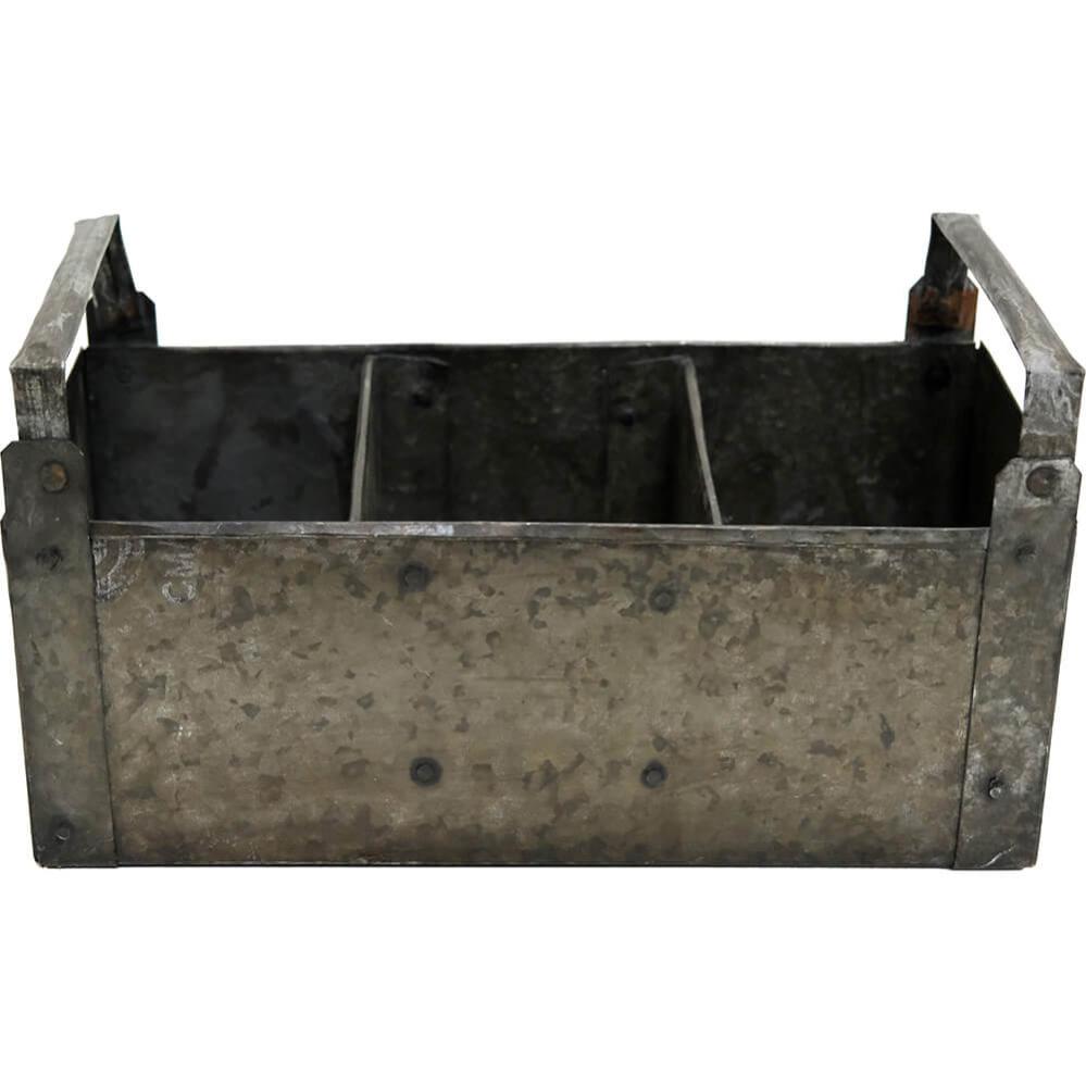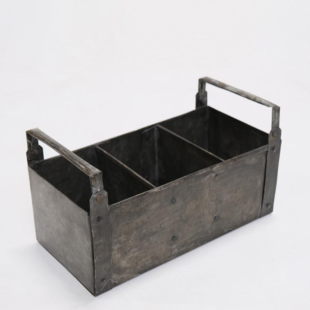 Flot og rå kasse med 3 rum og 2 håndtag. Denne lille kasse har rigtig mange anvendelsesmuligheder. Få styr på alle dine småting eller brug den til værktøj, strikketøj, krydderurter, olier eller på børneværelset til farveblyanter og blokke. Når den bliver overflødelig et sted, kan du bruge den et andet sted til opbevaring og i din indretning.