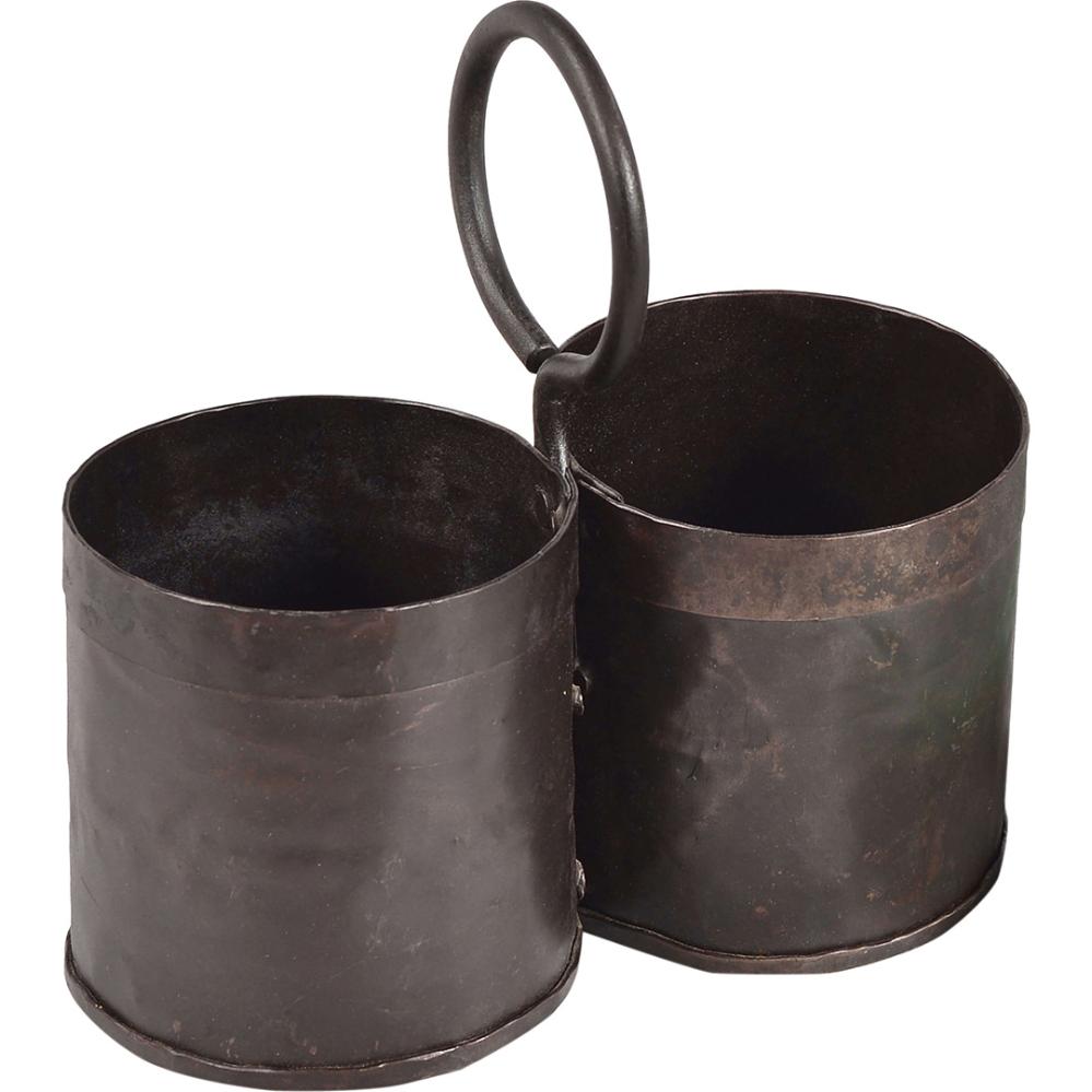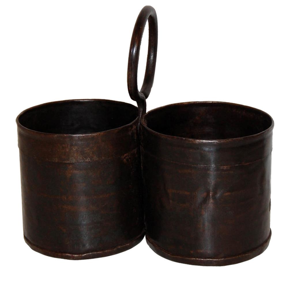 Denne dobbelte beholder i jern har et råt og industrielt udtryk, der tilfører karakter til enhver indretning. De to beholdere giver praktisk opbevaringsplads til f.eks. bestik, krydderier, kontorartikler eller planter, mens den runde ring gør den nem at flytte rundt på og let at hænge op på en krog eller væg. Den mørke jernfinish giver et autentisk look med fine variationer i overfladen. Bemærk, at potten ikke er vandtæt, og derfor bør fores med plastik eller forsynes med en lille indsats, hvis den bruges til planter eller frisk blomsterdekoration. Den angivne højde er inklusiv ophænget – selve bøtterne måler 11 cm i højden.