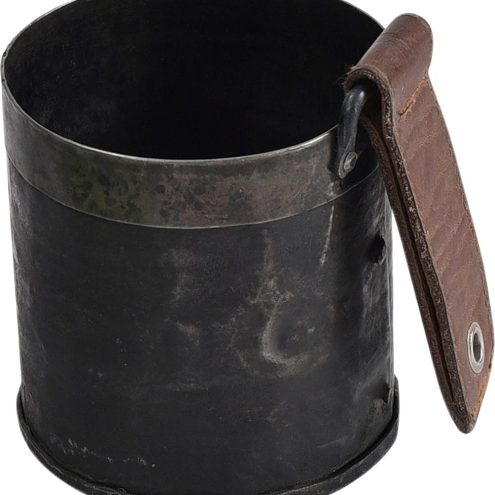 En stilfuld og rå beholder i jern med en skøn kontrast i form af den rå læderhank. Det industrielle design kombineret med den varme nuance fra læderet giver et spændende og tidløst udtryk, der passer perfekt ind i både moderne og rustikke miljøer. Brug bøtten til opbevaring, som urtepotte eller som en dekorativ detalje til divers nips. Bemærk, at bøtten ikke er vandtæt, og bør fores med plastik eller en lille indsats, hvis den bruges til planter. Højden er angivet inklusiv læderhanken. Selve bøtten måler 11 cm.