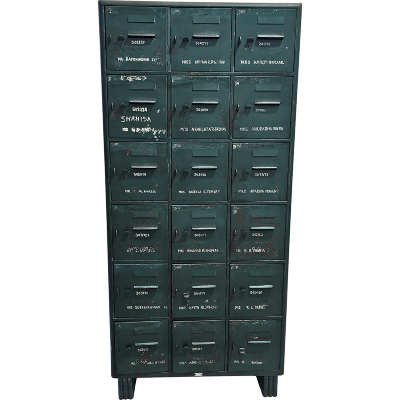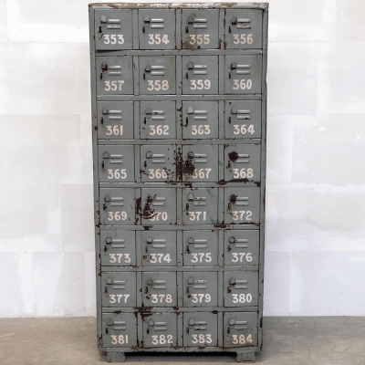 Vores lockers fås bl.a. med 3, 8 eller 18 låger og nogle med numre på front – men det er aldrig til at vide hvilke gamle vintage locker garderobeskabe i metal vi har på lager. For hos os findes de populære lockerskabe kun i meget få eksemplarer, og er hurtigt solgte. Du skal være hurtig, hvis du skal have fingre i de eftertragtede rå One of a Kind lockerskabe.