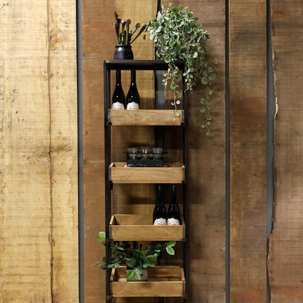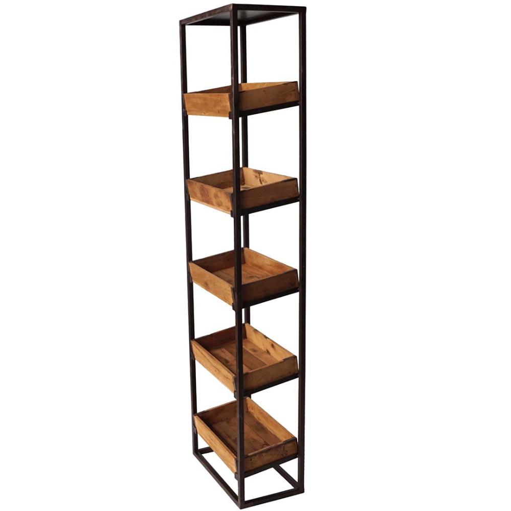 Smal høj jernreol med fem kasser fremstillet i genanvendt træ - alle trækasser er aftagelige. Reolen er yderst funktionel og praktisk. Til dig der vil have orden på tingene eller til dig, der ønsker at bruge reolen til en del af dit butiksinventar, så du kan præsenterer dine varer på en enkelt og overskuelig måde for dine kunder. Er perfekt til specialiteter, frugt og grønt, hårprodukter eller noget helt andet. God fornøjelse! Trækasse: 43x26x9 cm