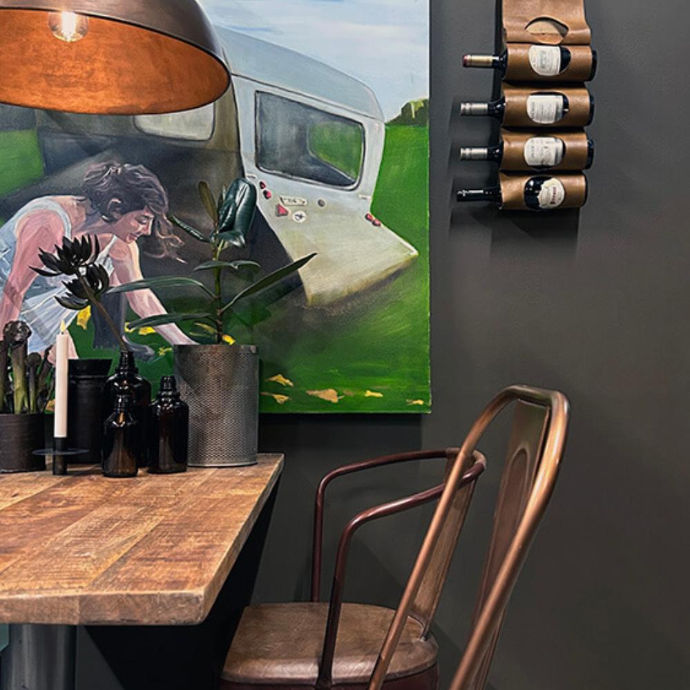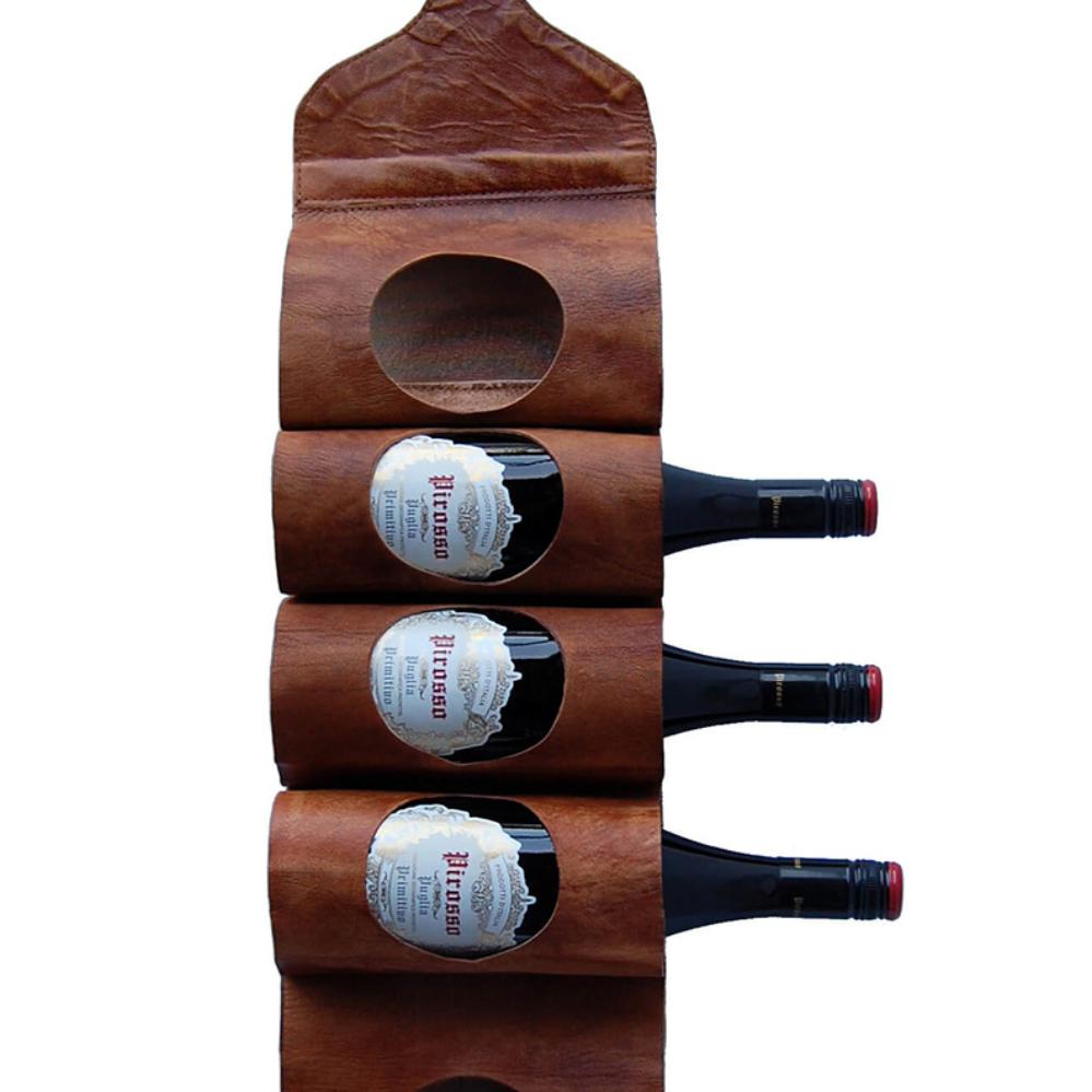 Her har du to-i-én. En magasinholder eller en vinholder, udført i brunt læder med plads til enten 5 flasker, 5 magasiner - eller et mix af begge. En vinreol i rustik look med kvalitet for øje og i skandinavisk stil. I designet er der tænkt på de små detaljer. Hullerne i læderet gør, at du kan se mærkatet på vinflasken eller navnet på magasinet. Den lille holder fylder ikke meget og kan derfor passe ind i de fleste hjem og vil også tage sig flot ud på væggen i din café eller restaurant.