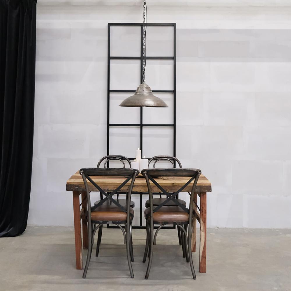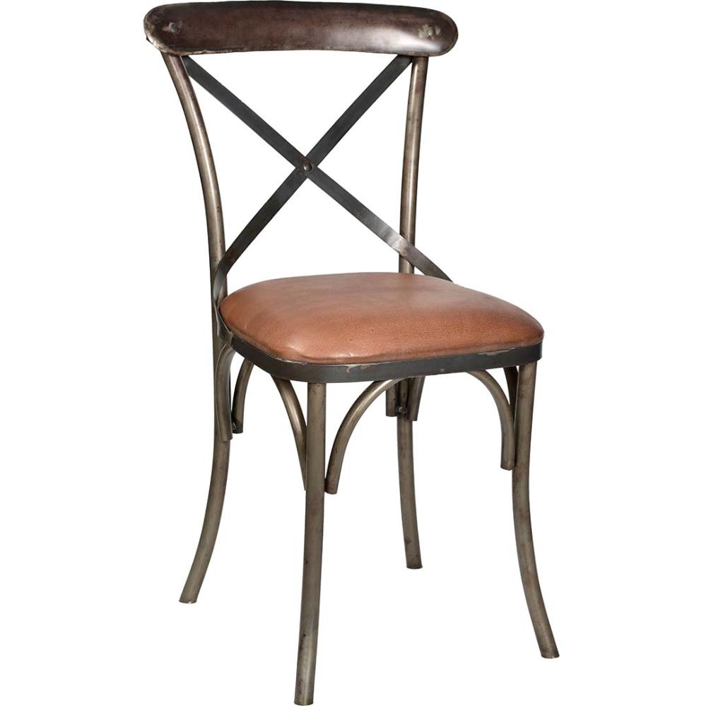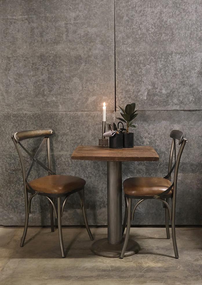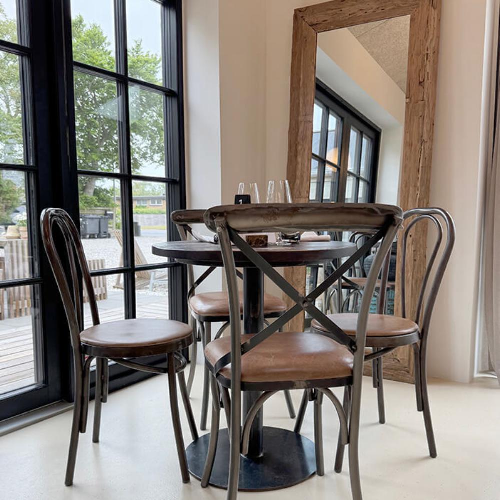 Bistro spisebordstol med kryds i ryggen. Denne klassiske spisebordstol er fremstillet i jern og har et polstret lædersæde som giver en ekstra komfort til stolen. Spisebordstolen er ideel at bruge både privat og i professionel sammenhæng. De synlige svejsninger giver stolen et råt udtryk der tilfører din indretning et moderne og rustikt look.