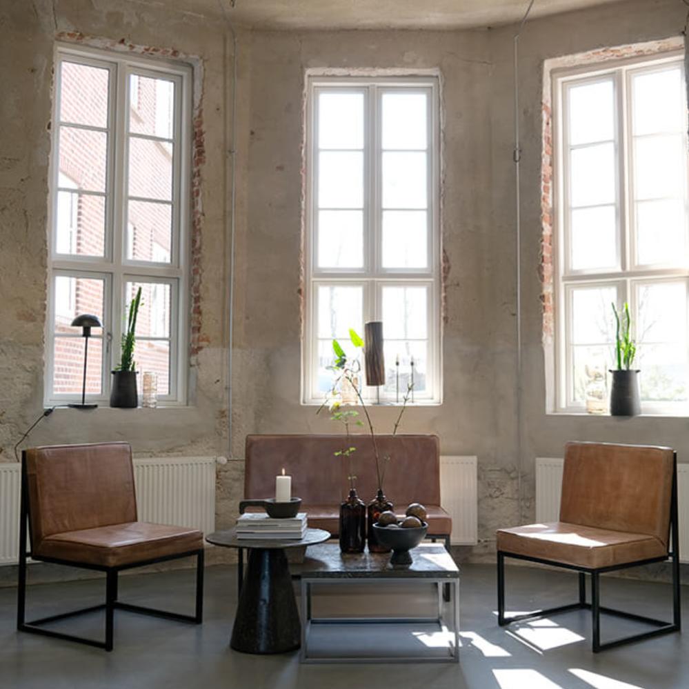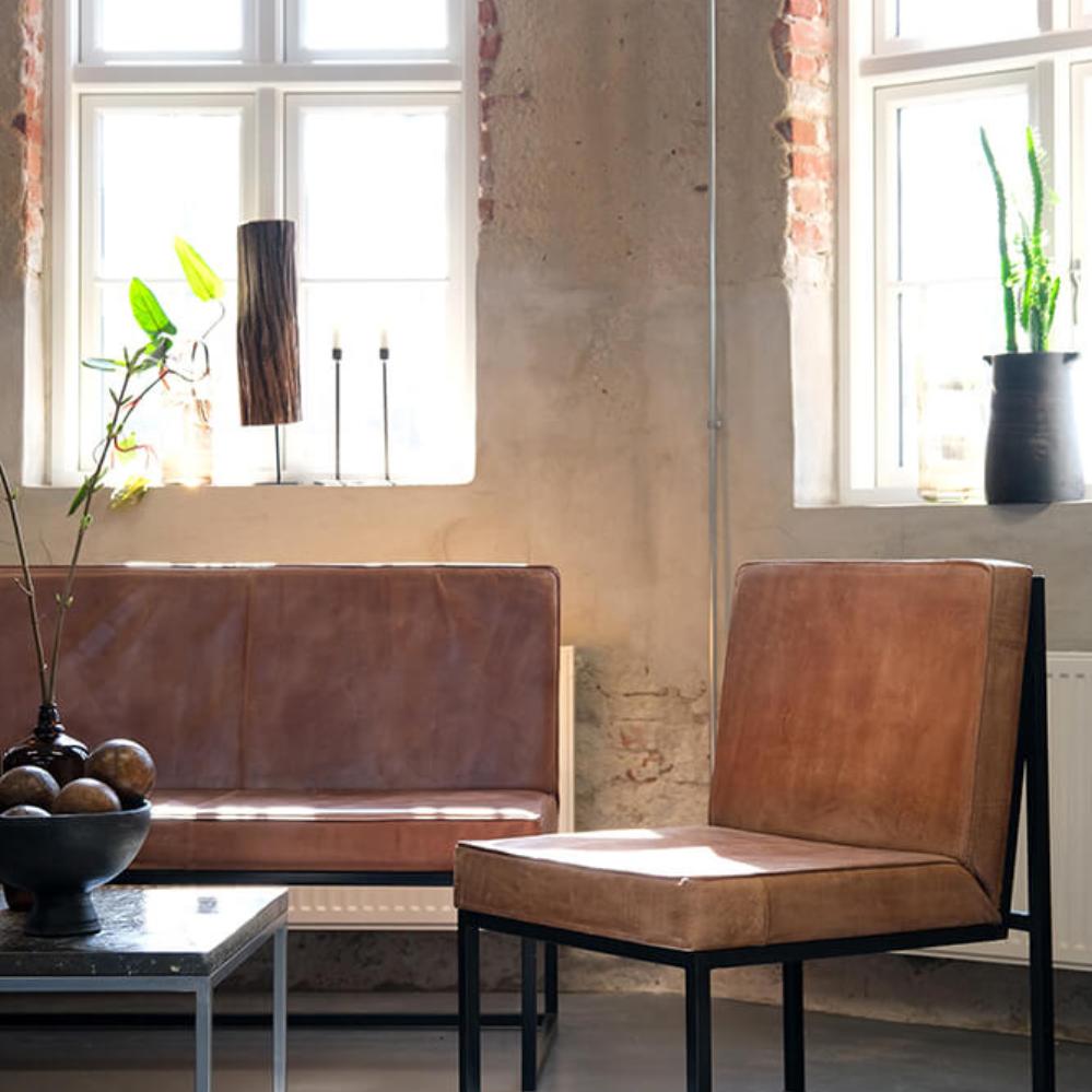 En stilfuld og maskulin loungestol, der kombinerer det rå med det komfortable. Stolen har et polstret sæde og ryg i varm, cognacfarvet læder, som udstråler både kvalitet og holdbarhed. Det enkle sorte metalstel giver stolen et moderne og industrielt præg, der passer perfekt ind i en rå og tidløs indretning. Læderet får med tiden en smuk patina, som kun vil gøre stolen endnu mere charmerende. Perfekt til en afslappet hyggekrog i hjemmet, som en cool detalje i loungen på en café eller som stilfuldt møblement i en restaurant. En loungestol med kant og komfort, der holder i mange år.