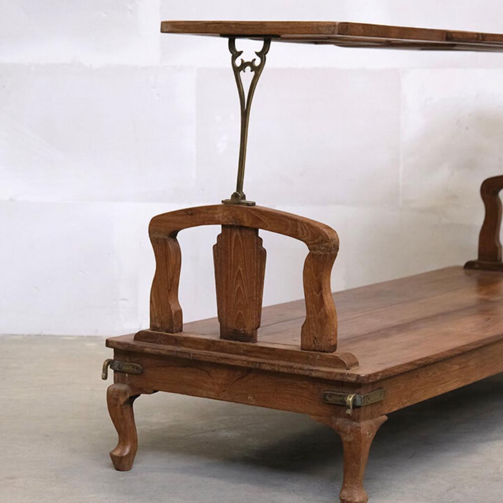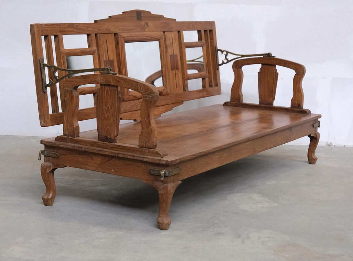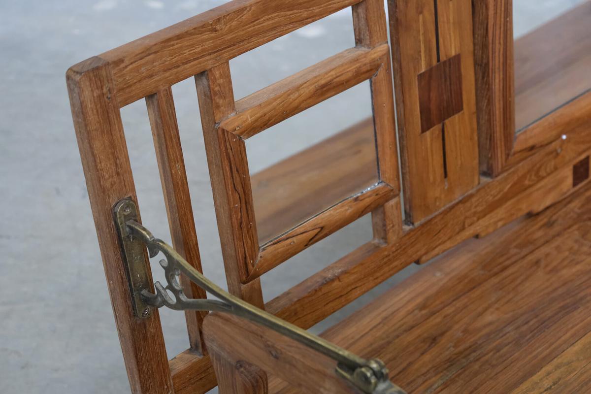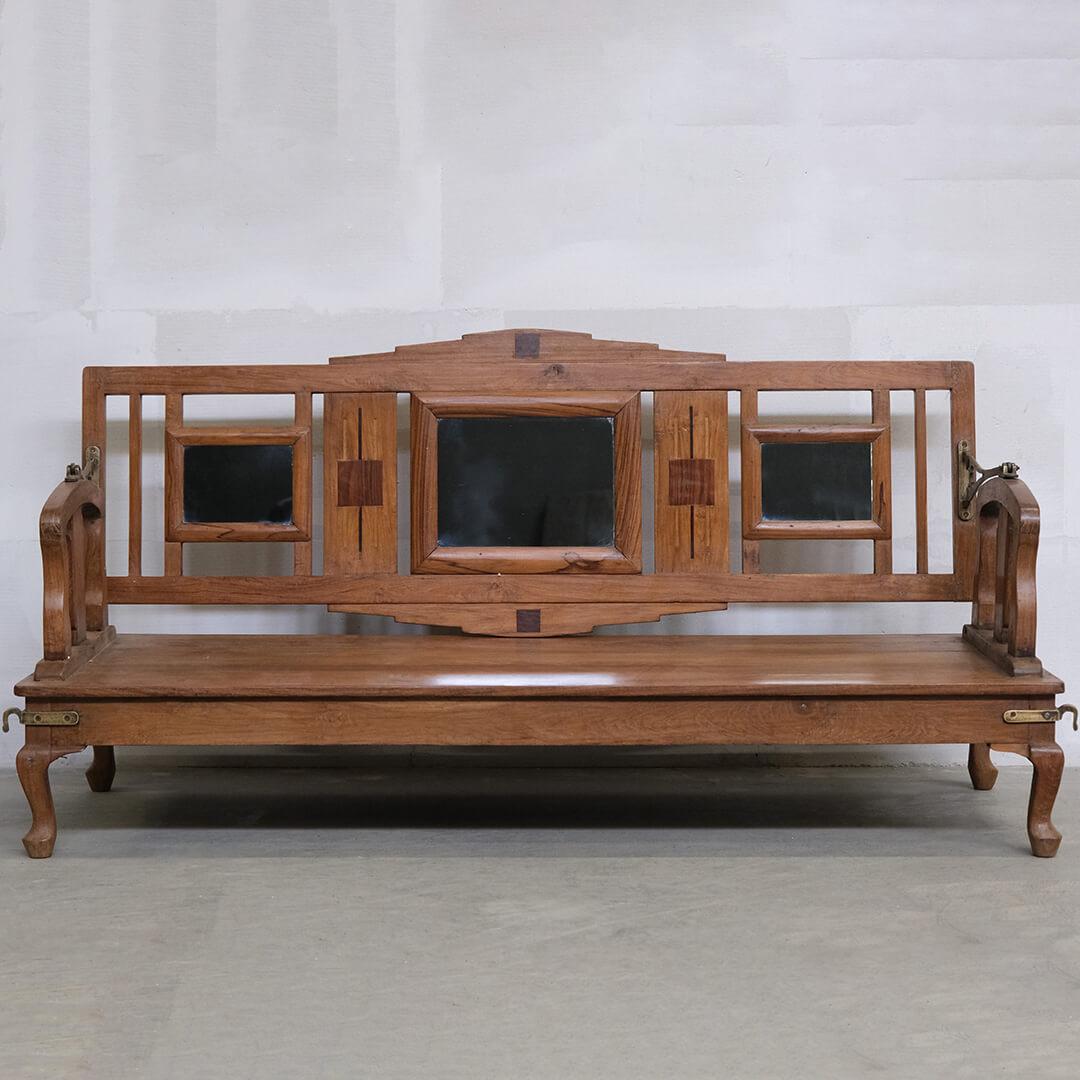 Skøn gammel bænk med mange flotte og sjove detaljer. Den sjoveste detaljer er at du kan svinge ryglænet op over bænken og dermed bruge den fra begge sider. Desuden har den 3 spejle i ryglænet og fint svungne ben.