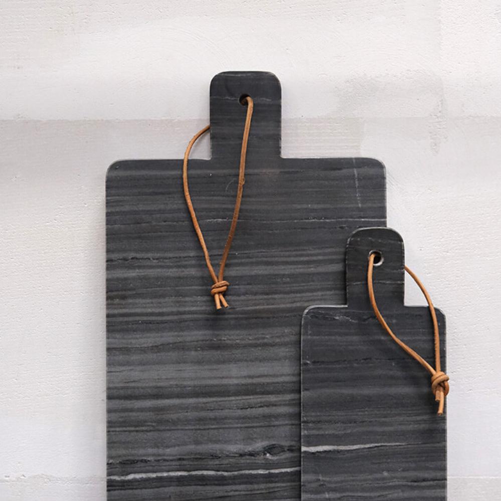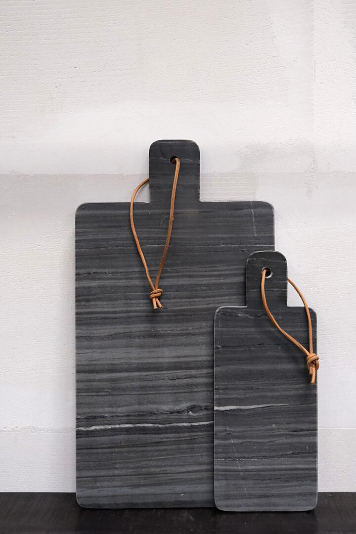 Flot smalt aflangt serveringsbræt i grålig marmor med brun læderstrop. Brættet kan bruges til at servere lækre tapasretter på eller brug det som en flot alternativ tallerken. Det er også virkelig flot at have stående fremme, når det ikke er i brug. OBS! Kan variere i farvespil og udtryk.