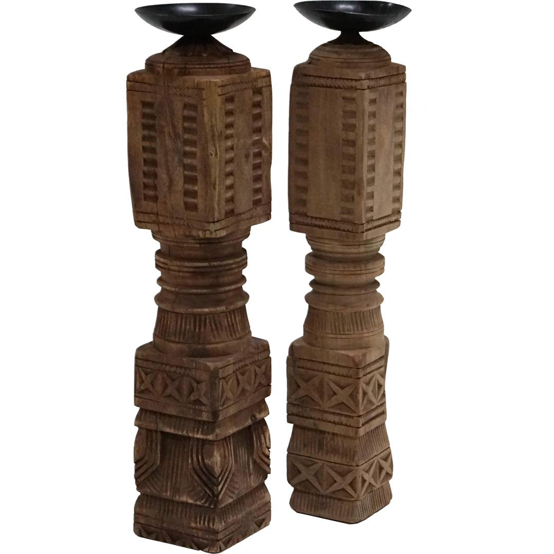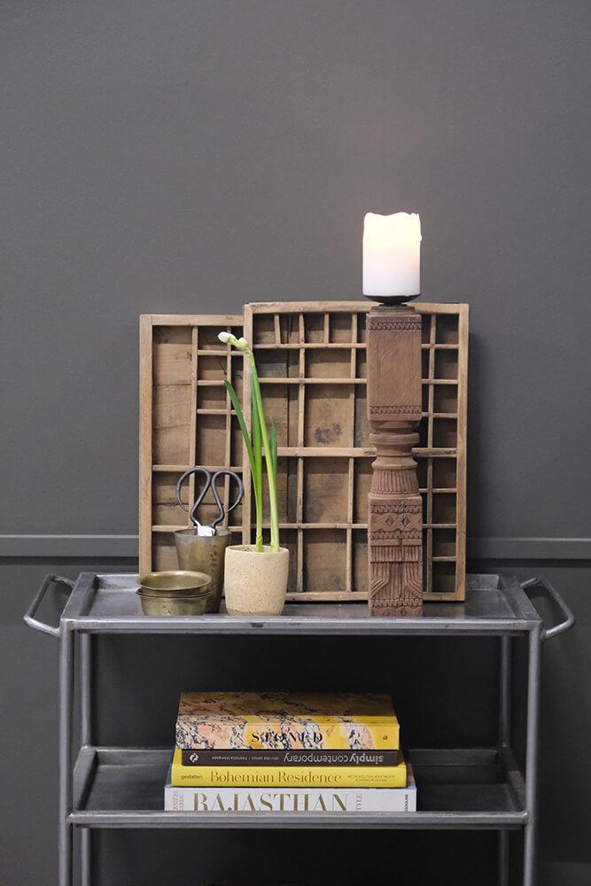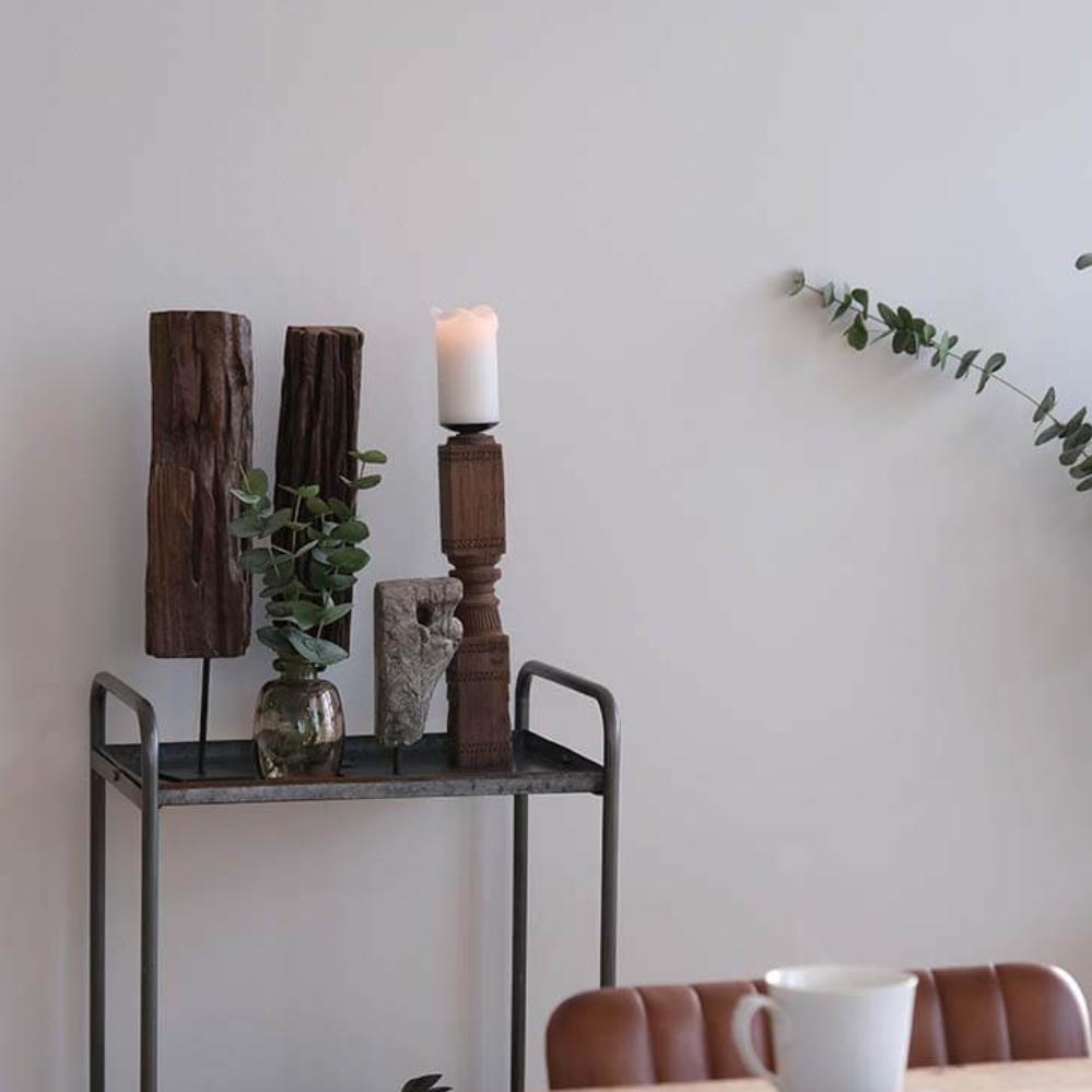 De ser måske ud som noget, der kunne stå i en gammel indisk paladsentré, men Bastian lysestagerne er landet midt i det moderne, rå interiørunivers. De er håndlavet af genanvendt træ og bærer smukke udskæringer, der varierer fra stage til stage. Det solide træ har fået lov at beholde sine spor fra tidligere liv, og det er netop det, der giver dem deres autentiske udtryk. Ikke to er ens, og det er hele pointen. Udskæringerne giver en følelse af håndværk og historie, og den mørke jernskål på toppen skaber en fin kontrast til det varme træ. Sæt dem midt på et langbord i restauranten, i vindueskarmen i stuen eller som et skulpturelt element i entréen. De fungerer både som et par og solo og skaber hygge med kant – uanset om lyset er tændt eller ej.