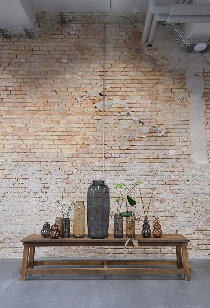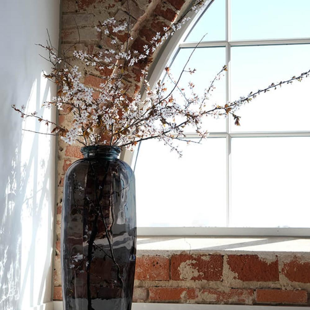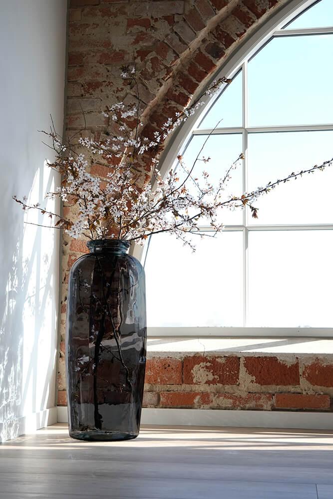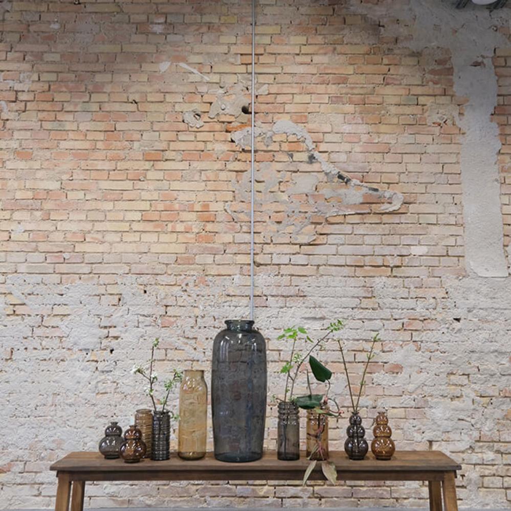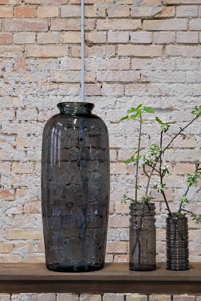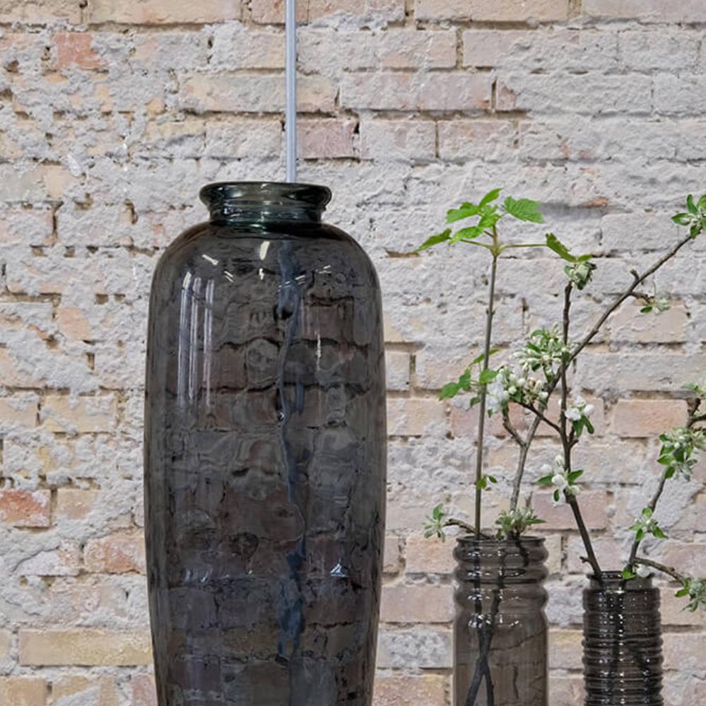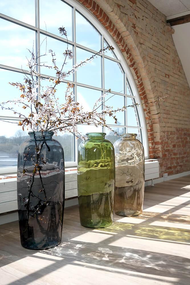 Smuk gulvvase fremstillet af genanvendt glas. Den høje, slanke form gør den ideel til årstidens grene eller dekorative blomster. Vasen fås i flere farver, så du kan finde den, der passer perfekt til dit hjem eller din forretning. Små bobler og ujævnheder i glasset understreger vasens naturlige og unikke udtryk, da den er i genbrugsglas.