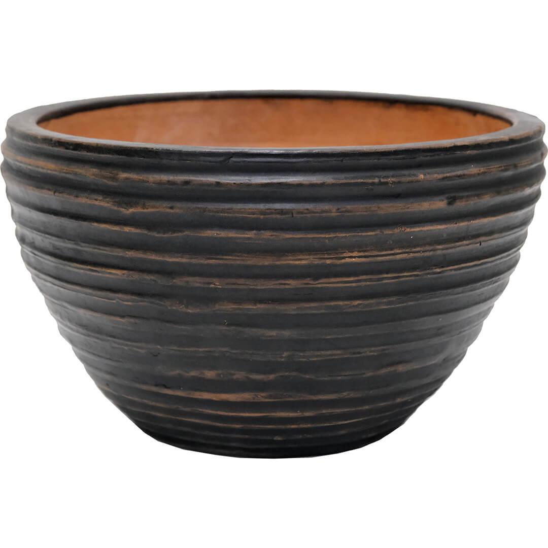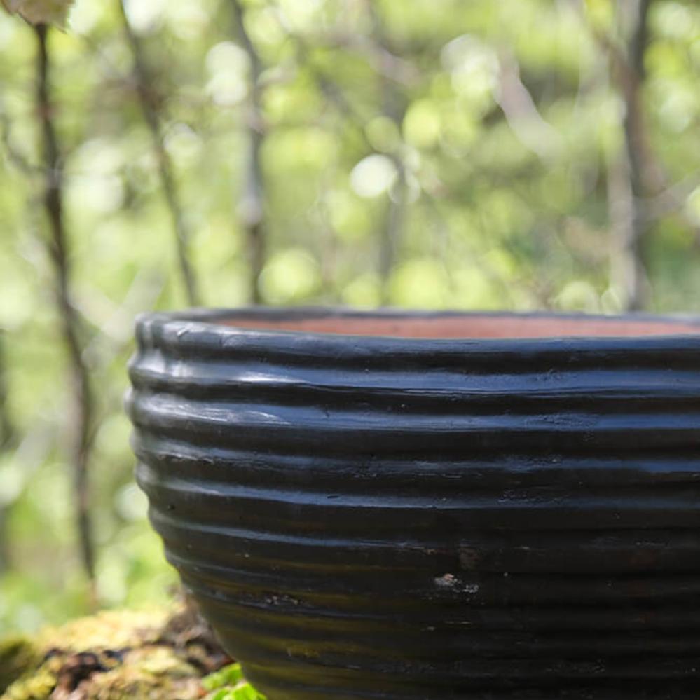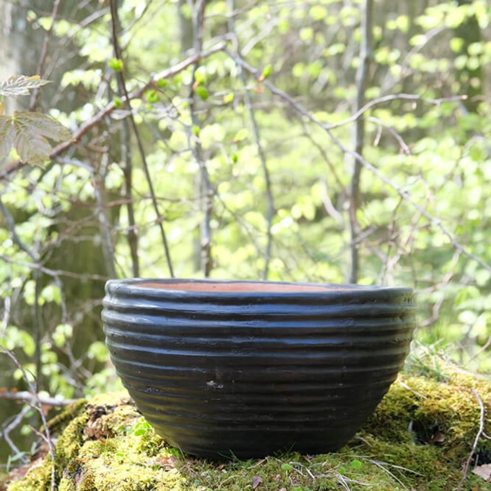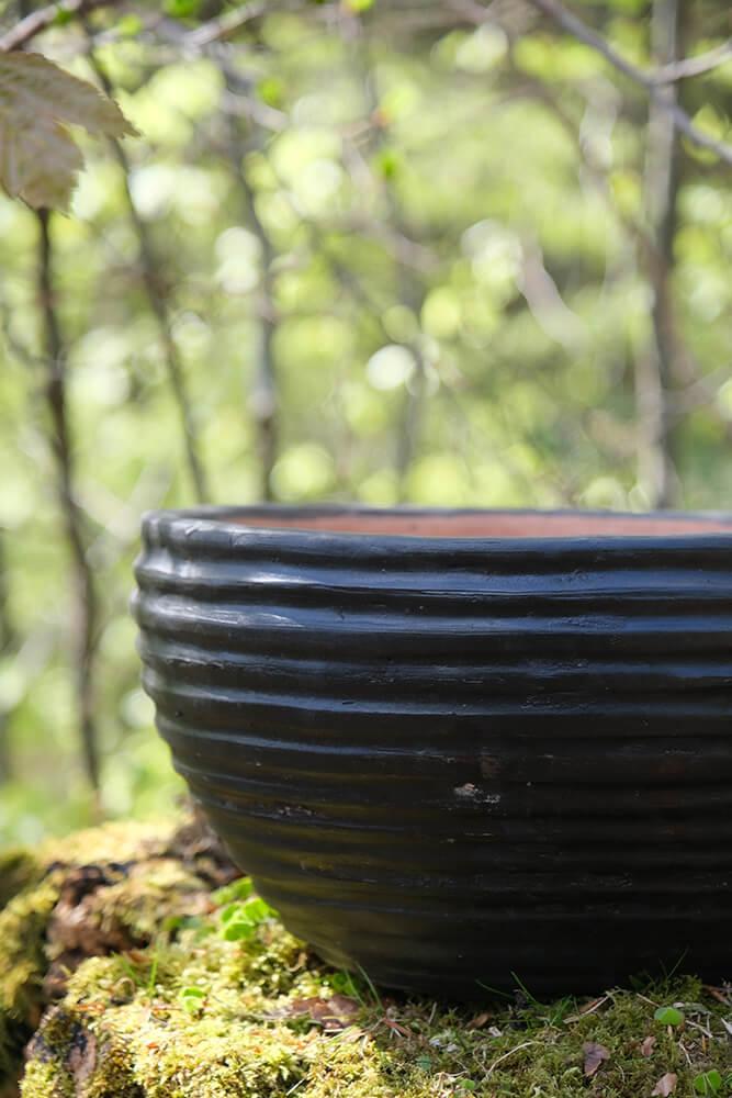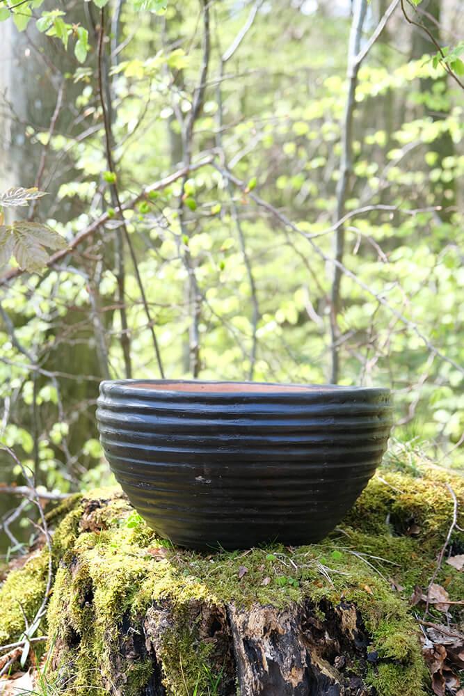 Mørk lerkrukke med riller. Denne dekorative lerkrukke har en dejlig patina og kan f.eks. benyttes til blomster og planter. Krukken er ikke vandtæt, så en plastikindsats eller lignende bør tilføjes, hvis krukken bruges til planter.