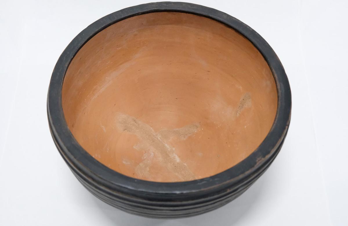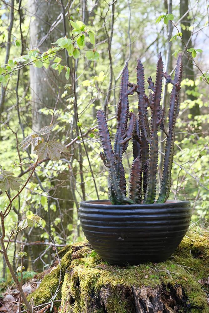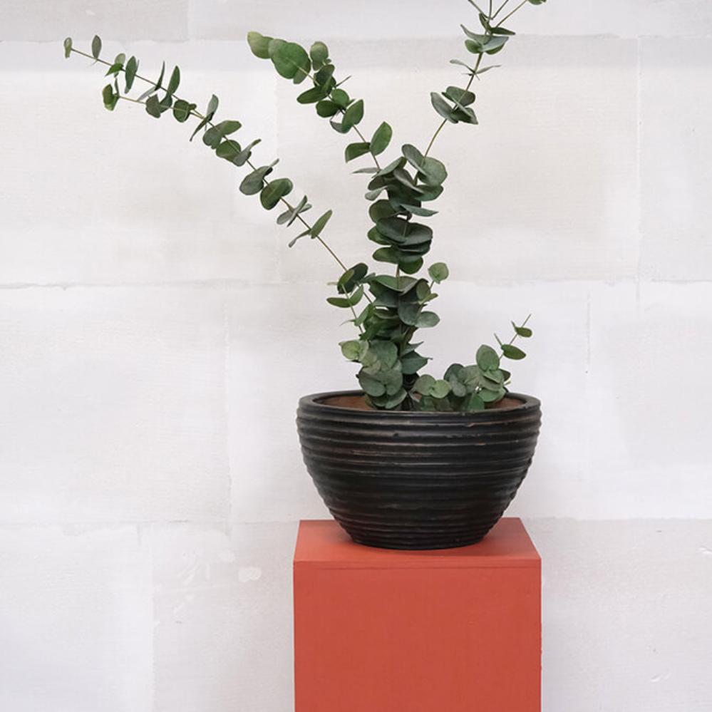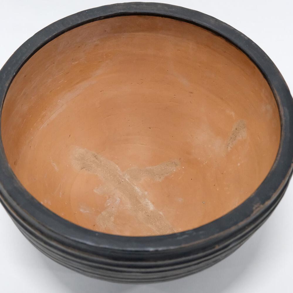 Mørk lerkrukke med riller. Denne dekorative lerkrukke har en dejlig patina og kan f.eks. benyttes til blomster og planter. Krukken er ikke vandtæt, så en plastikindsats eller lignende bør tilføjes, hvis krukken bruges til planter.