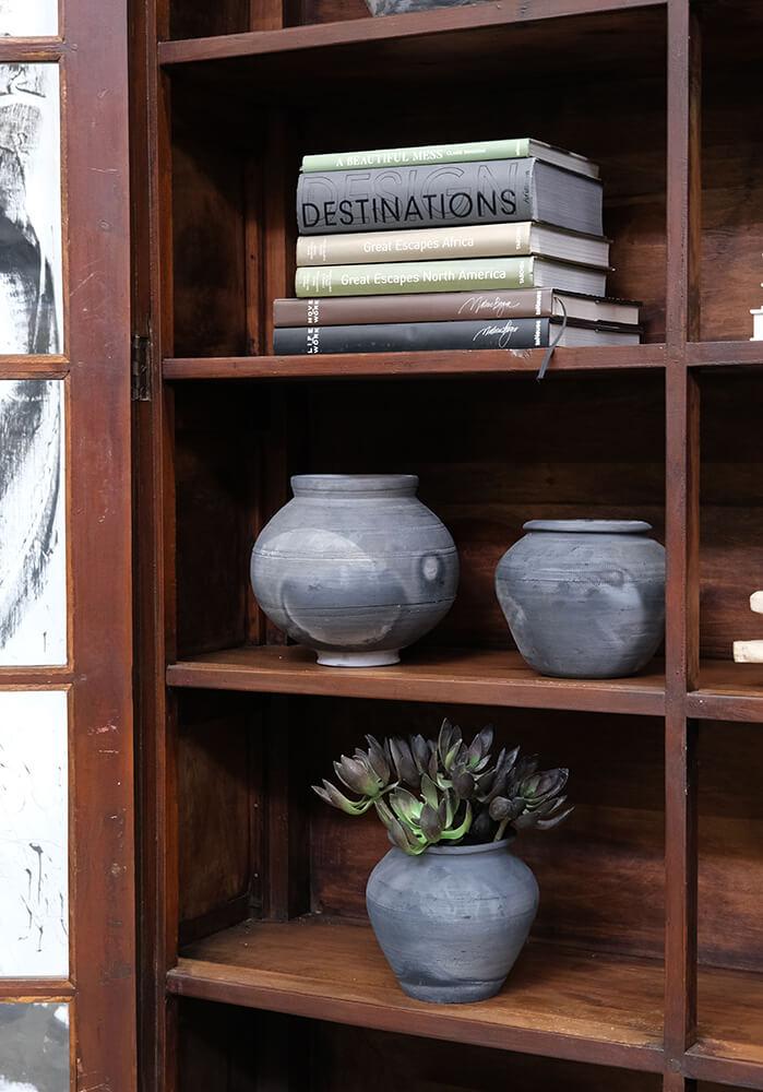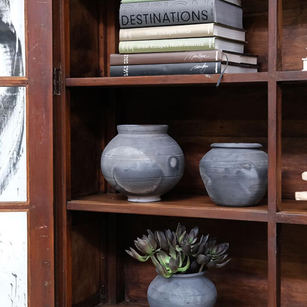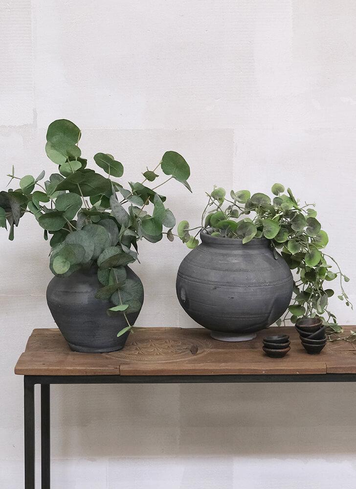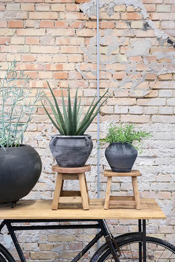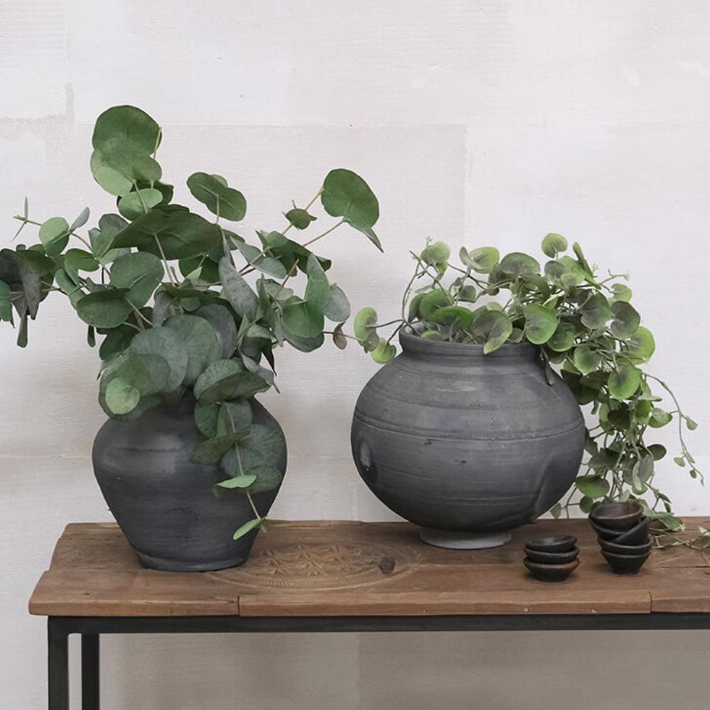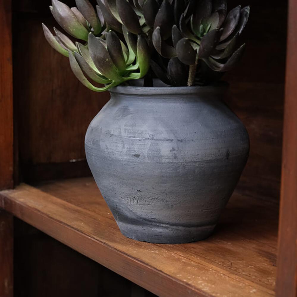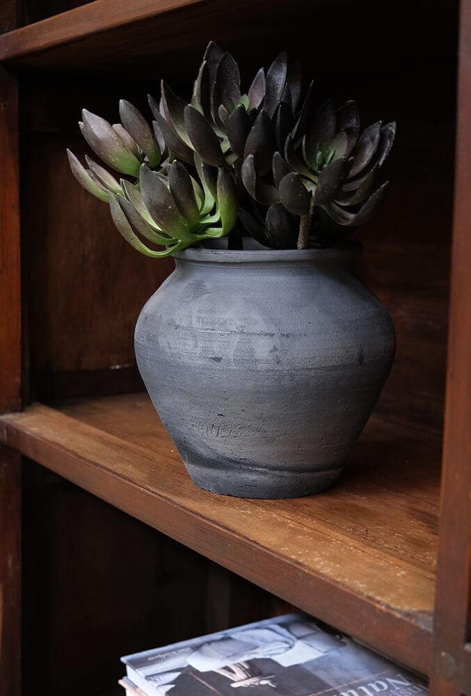 Denne mørke lerkrukke udstråler rustik charme og naturlig elegance. Med sin klassiske, afrundede form og rå overflade er den perfekt som en dekorativ detalje i din indretning. Brug den til at plante grønne planter eller som et stand-alone statement piece i din indretning. Krukkens patina og håndlavede udtryk tilfører personlighed og sjæl til ethvert rum. Krukken er ikke vandtæt, så vi anbefaler et plastikindlæg, hvis du planter noget i den.