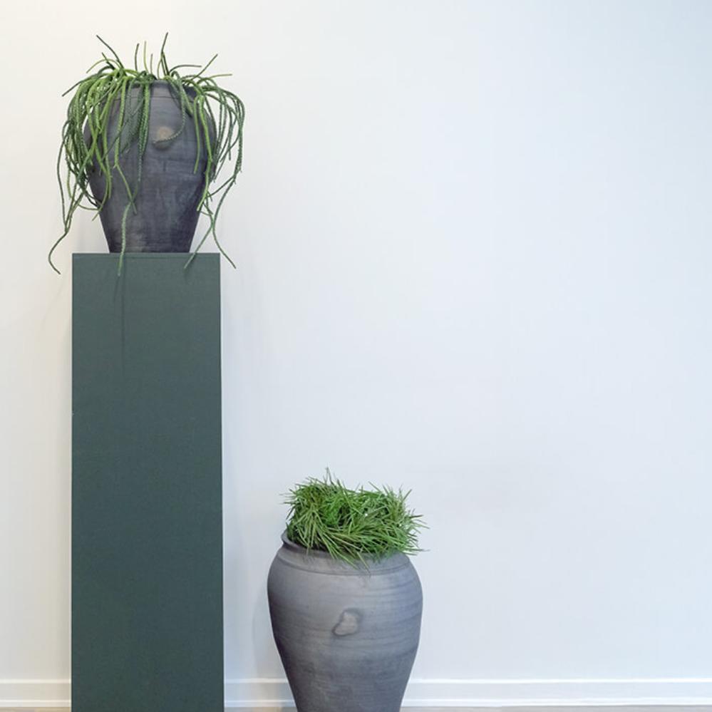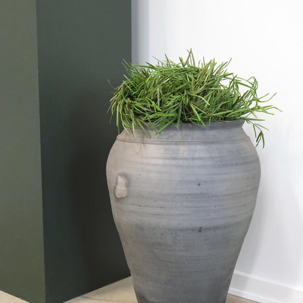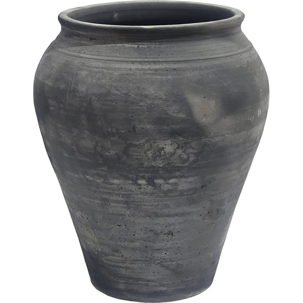 Denne lerkrukke er beviset på, at enkelthed og karakter sagtens kan gå hånd i hånd. Med sin højde på 50 cm og en rummelig åbning på 26 cm, giver krukken dig masser af muligheder, både som gulvvase, dekoration eller til tørrede grene og blomster. Overfladen er mørk og levende, med fine nuancer og små variationer, der giver et råt, næsten stenhugger-agtigt udtryk. Den organiske form og det klassiske design gør den tidløs og nem at matche med både moderne, rustik og industriel indretning. Brug lerkrukken alene som et skulpturelt element, eller lad den indgå i et mix med andre vaser, krukker og fund, både i private hjem og kommercielle miljøer som butikker, hoteller og restauranter.