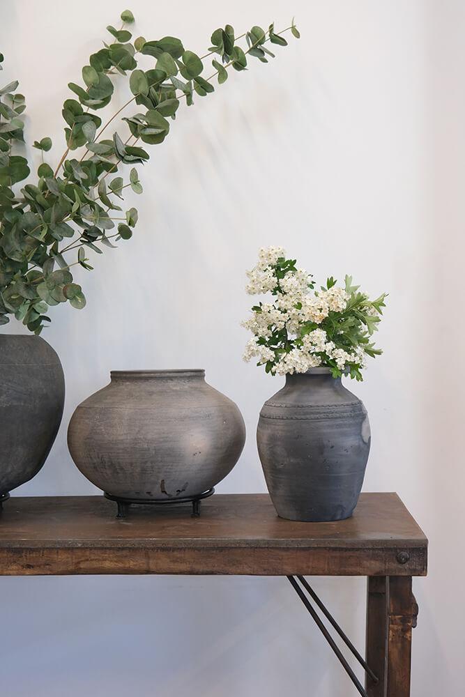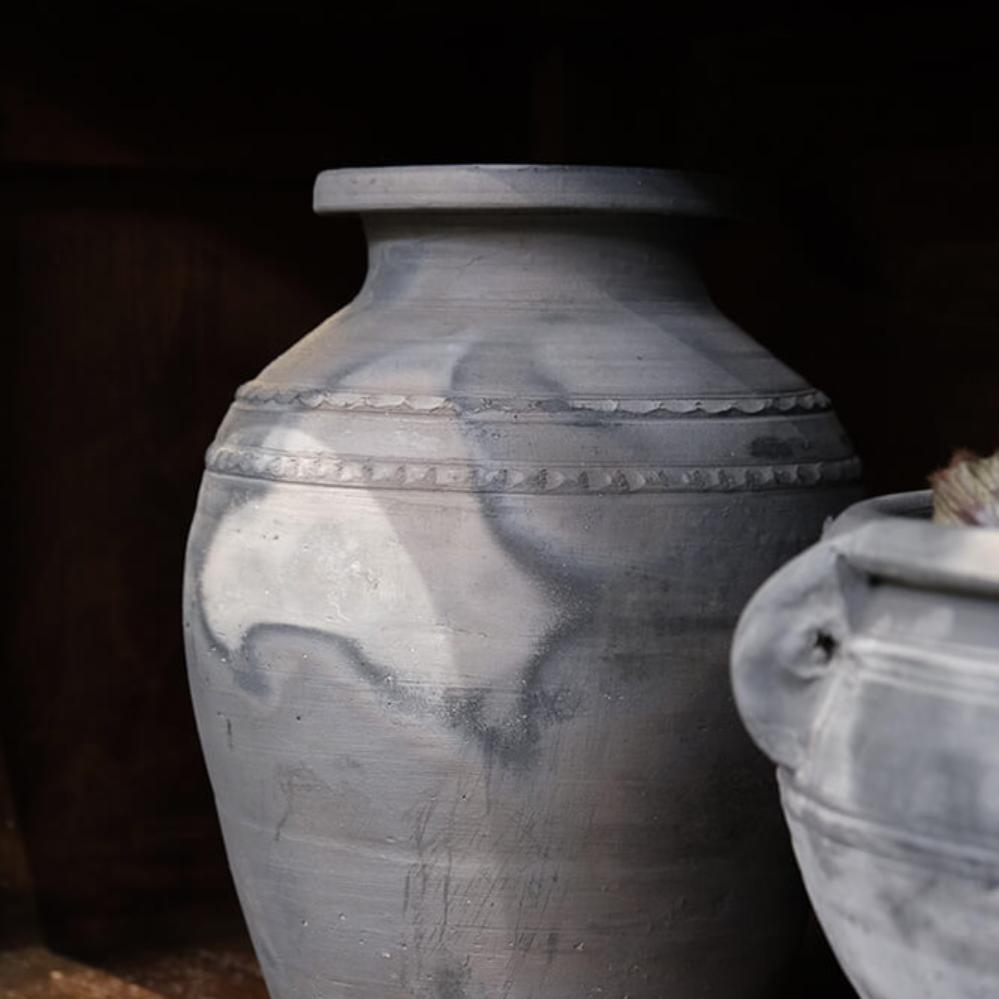 Denne lerkrukke har en klassisk form med smukke detaljerede mønstre omkring halsen, der giver den et autentisk udtryk. Den mørke patina og variationerne i overfladen giver et håndlavet udtryk. Perfekt som en statement-dekoration i et moderne eller rustikt hjem. Den kan bruges til tørrede blomster, grene eller blot som en selvstændig stemningsspreder, der bringer varme og personlighed til rummet. Bemærk venligst at krukken ikke er vandtæt
