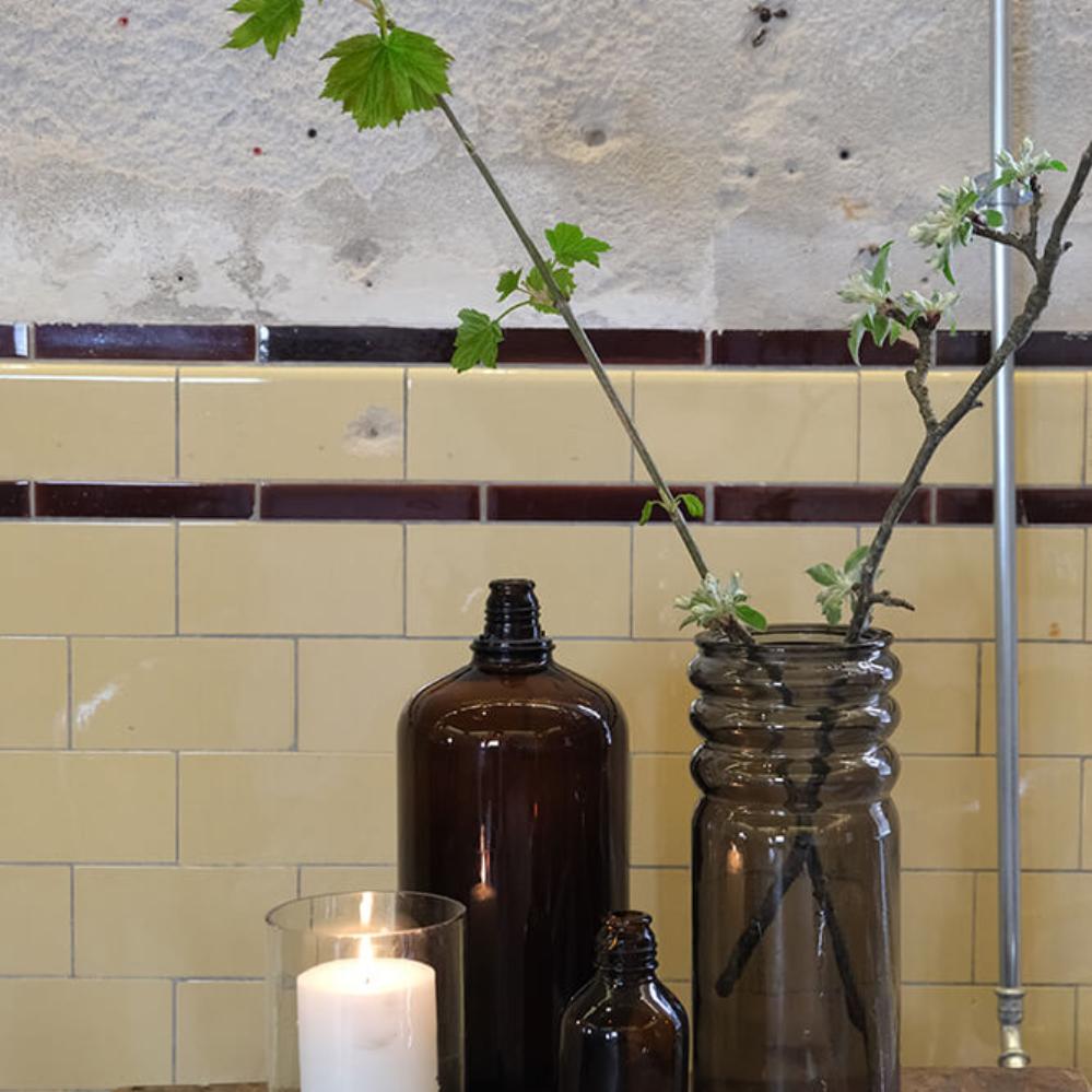 Meget små, iøjnefaldende, originale industriglasflasker i kraftigt brunt glas. Tilføj indretningen en ekstra lille detalje med disse små, industrielle glasflasker. Cemmi flaskerne har tidligere været brugt til opbevaring af forskellige kemikalier, men vi foretrækker en enkelt stilk eller gren. Cemmi flaskerne fås i flere forskellige størrelser som med fordel kan kombineres for et mere personligt look.