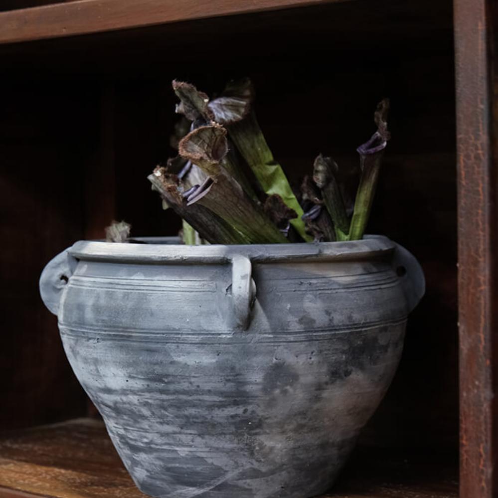 Denne robuste lerkrukke er et ægte stykke håndværk med sit rå og autentiske udtryk. Rillerne og de praktiske håndtag gør den både funktionel og dekorativ. Perfekt til at plante frodige grønne planter, skabe stemning i en gårdhave, eller som en rustik detalje i din indretning. Krukkens naturlige farvetoner og håndlavede patina giver et charmerende og rustikt præg, der passer ind i både moderne og traditionelle miljøer. Bemærk at krukken ikke er vandtæt eller frostsikker.