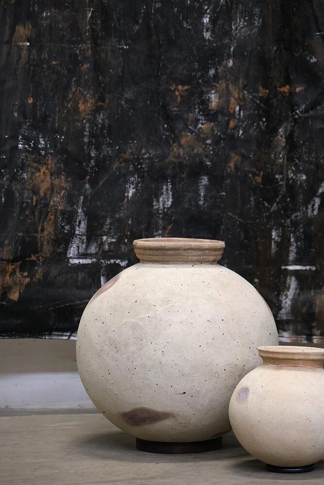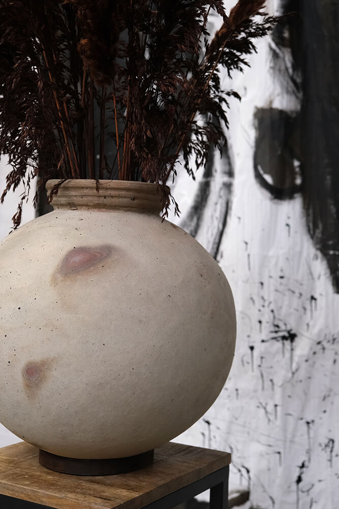 Dette er den største Dali lerkrukke med en højde på 44 cm. Den ru, lyse overflade og den enkle form giver et organisk udtryk, mens jernringen i bunden sørger for stabilitet. Brug den som et dekorativt element eksempelvis med tørrede blomster. Krukken fås i to mindre størrelser – og husk, den tåler ikke frost.