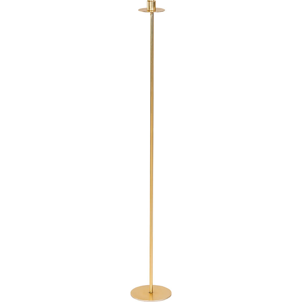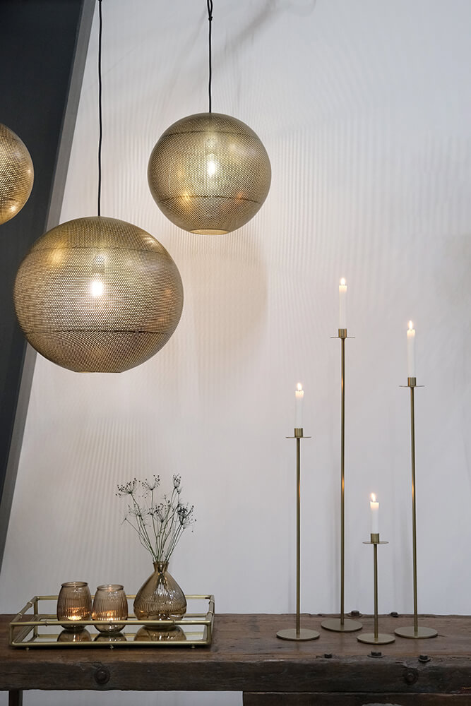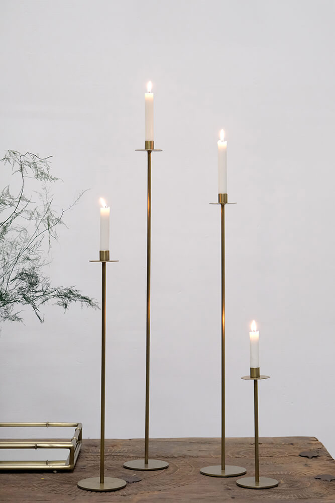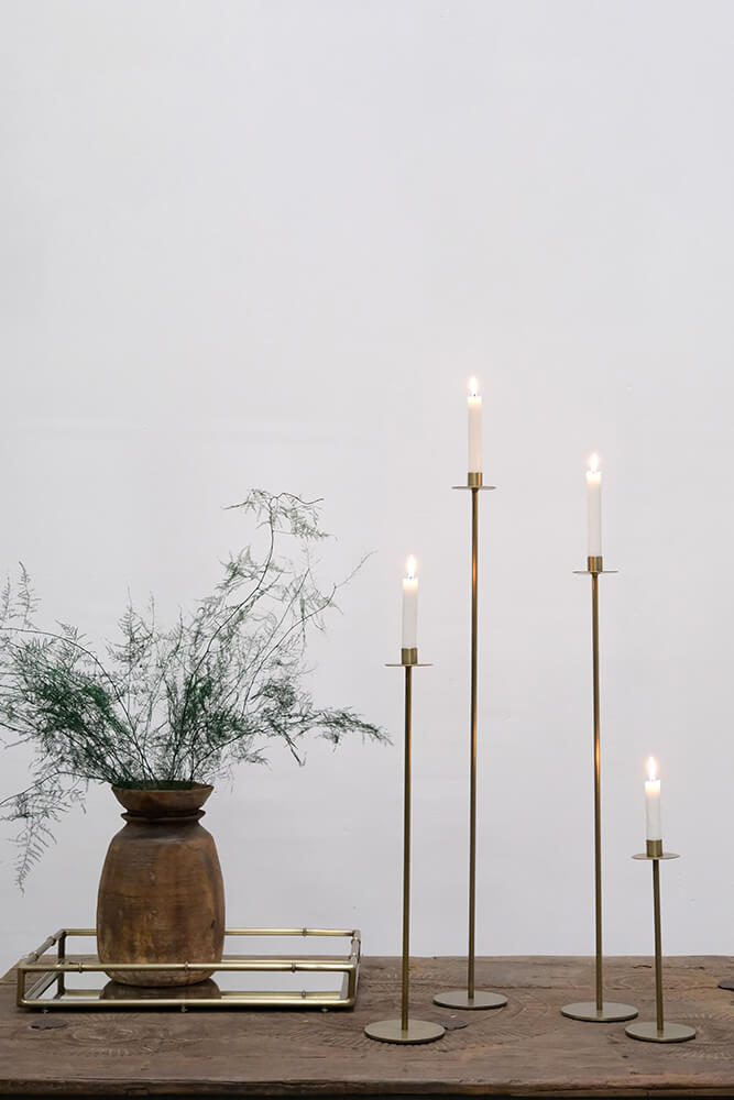 Denne 90 cm høje lysestage er den mest markante i Dean-serien og skabt til at gøre indtryk. Med sin ekstra højde tilfører den rummet tyngde, ro og en tydelig vertikal linje, som giver indretningen mere spil. Den er fremstillet i jern og malet i en varm messingfarve, der giver et råt, men indbydende udtryk. Lysestagen egner sig særligt godt som gulvlysestage, perfekt ved sofaen, i et hjørne eller som en del af en større opstilling med flere stager i forskellige højder. Det enkle formsprog gør, at den både kan stå alene og indgå i en gruppe uden at dominere for meget. Dean-serien fås i flere størrelser og farver, hvilket gør det nemt at skabe et personligt og sammenhængende udtryk i indretningen.