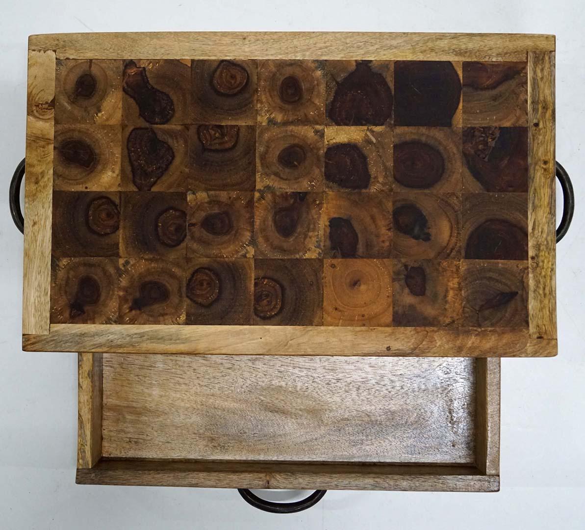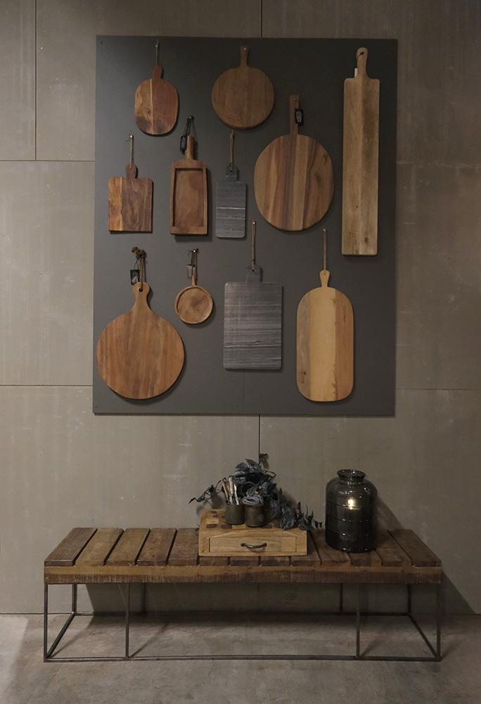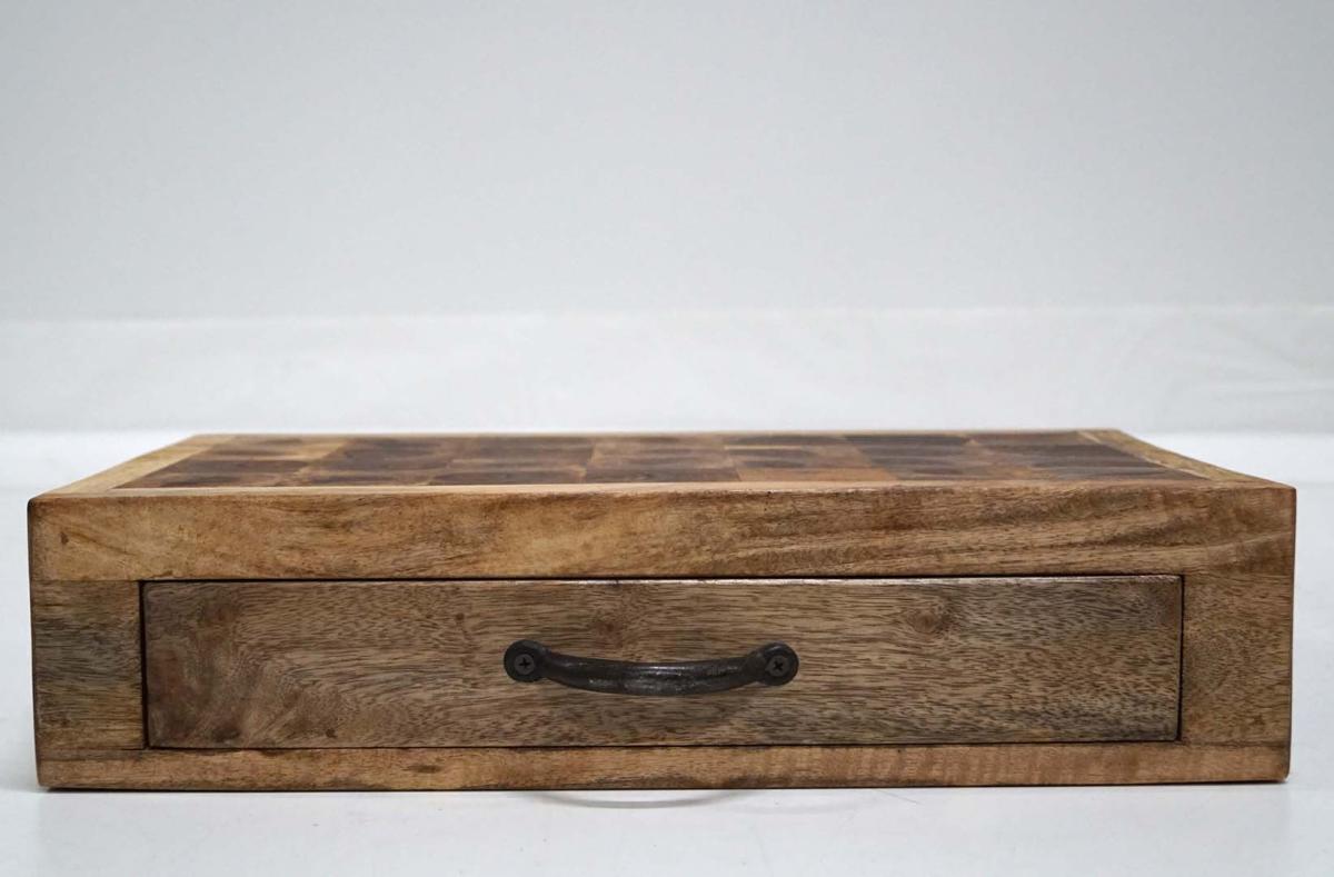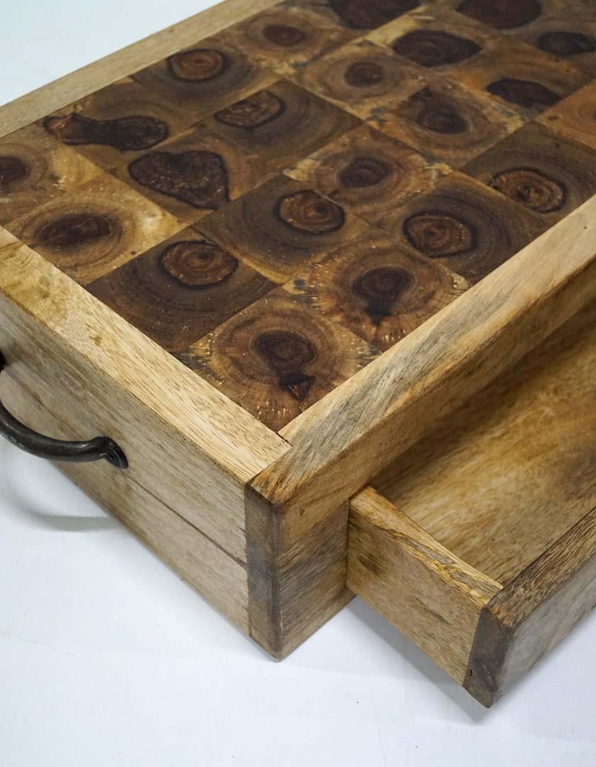 Rustikt skærebræt i træ og med aftagelig og funktionel skuffe, hvor det snittede nemt kan opbevares og flyttes til den store gryde. Du kan med fordel gemme dine knive i den praktisk lille skuffe der er i møblet. Brug vand og sæbe til rengøringen, og forlæng holdbarheden ved at smøre brættet med vegetabilsk olie. Opvaskemaskine anbefales ikke.