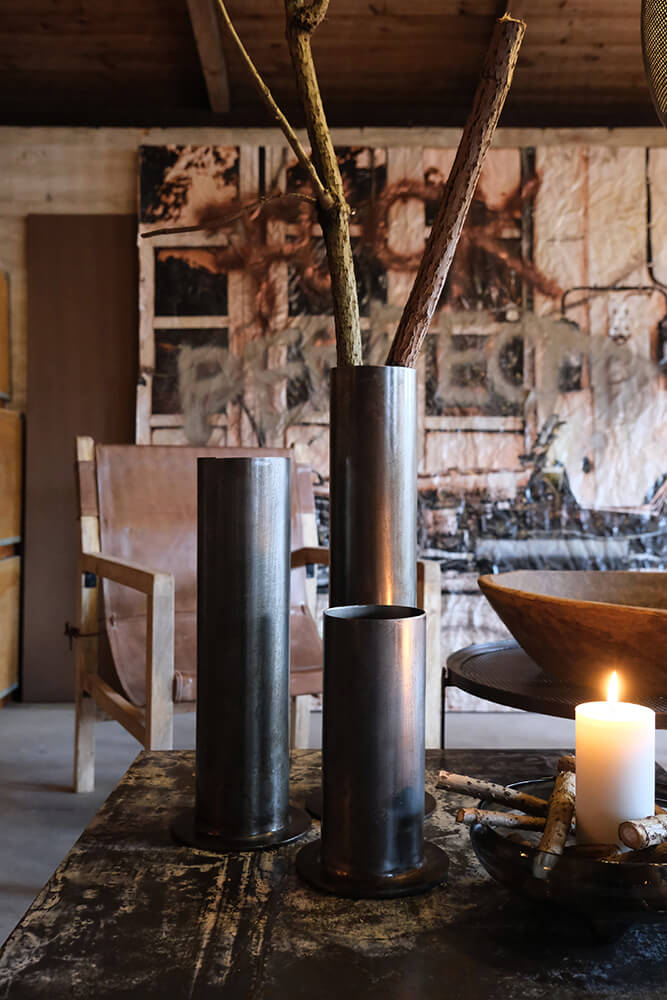 Mellemhøj rustik vase i pulverlakeret jern. Det rå jernlook og minimalistiske design er både tidsløst og har evnen til at skille sig ud. Vasen er perfekt til grene eller afskårne planter og blomster, og vil give en rå stemning til både dit middagsbord eller der hvor du ellers stiller en vase. Vi anbefaler at bruge en indsats, da vasen ellers vil ruste og vi ikke kan garantere at den er 100% vandtæt.