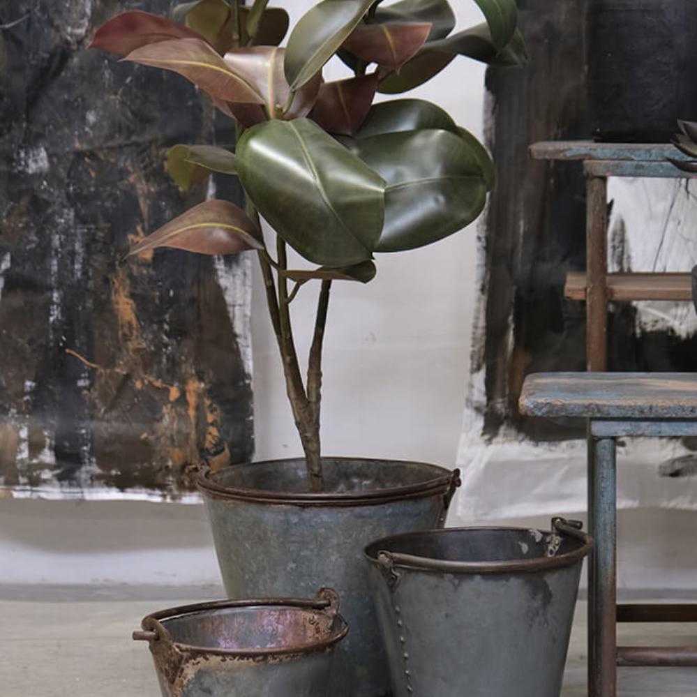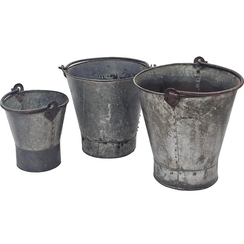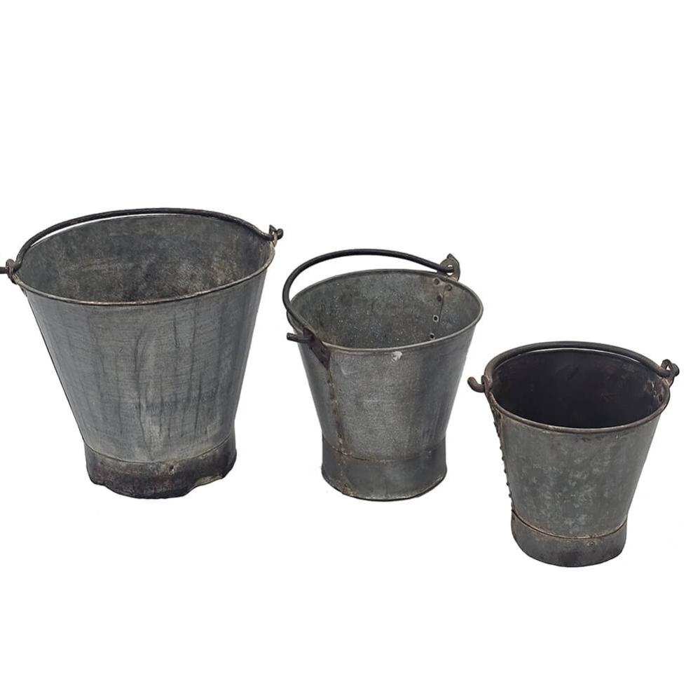 Disse gamle jernspande kommer i et sæt med 3 stk. i 3 forskellige størrelser. De udstråler autentisk og rustik charme med deres slidte patina og robuste konstruktion. Spandene er ikke bare praktiske, de er også fine som dekorative elementer, da hver spand med deres små skønhedsfejl fortæller om deres tidligere brug. Brug dem som plantekrukker på terrassen, i haven eller som rå opbevaringsspande eller vinkølere. De kan også fungere som unikke dekorationselementer i en butik eller café, hvor de vil tilføre et råt, industrielt præg til rummet. Uanset hvor de placeres, vil disse spande med garanti tilføje masser af karakter og historie til din indretning. Medium: H: 30cm x D: 32cm Small: H: 24cm x D: 29cm
