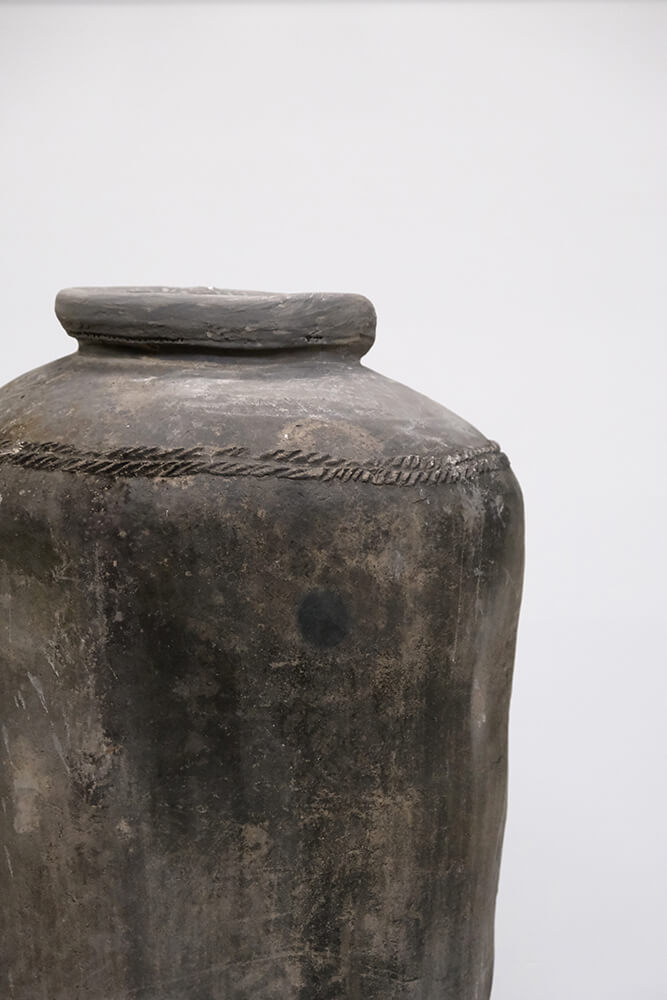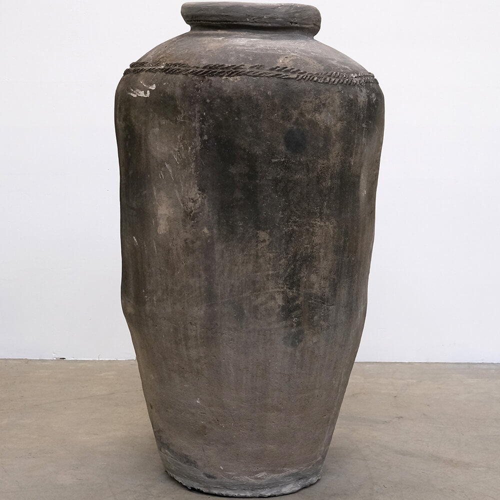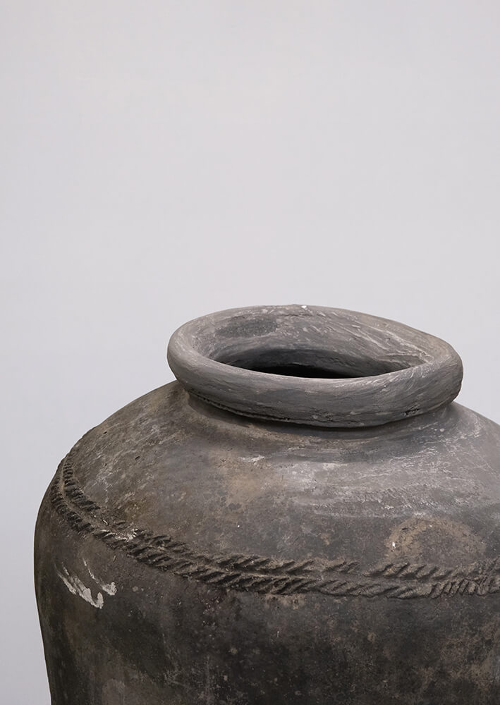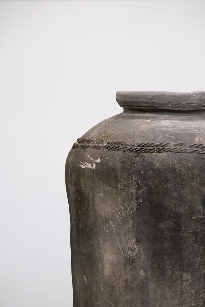 Den her krukke fylder; ikke bare i størrelse, men i udtryk. Det er en gammel, håndlavet krukke med en rolig, tung form og en overflade, der har fået lov til at ældes i sit eget tempo. De støvede mørkegrå nuancer er brudt af lyse aftegninger og små spor, som kun opstår, når noget har stået ude i verden længe nok. Den er ikke finpoleret, og det skal den heller ikke være. Uanset om du smider et par store grene i den eller lader den stå tom, så trækker den opmærksomhed uden at larme. Bemærk: Krukken er ikke vandtæt.