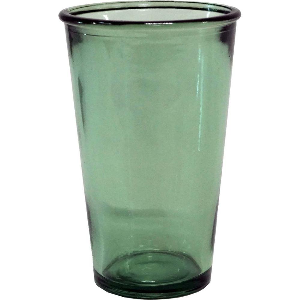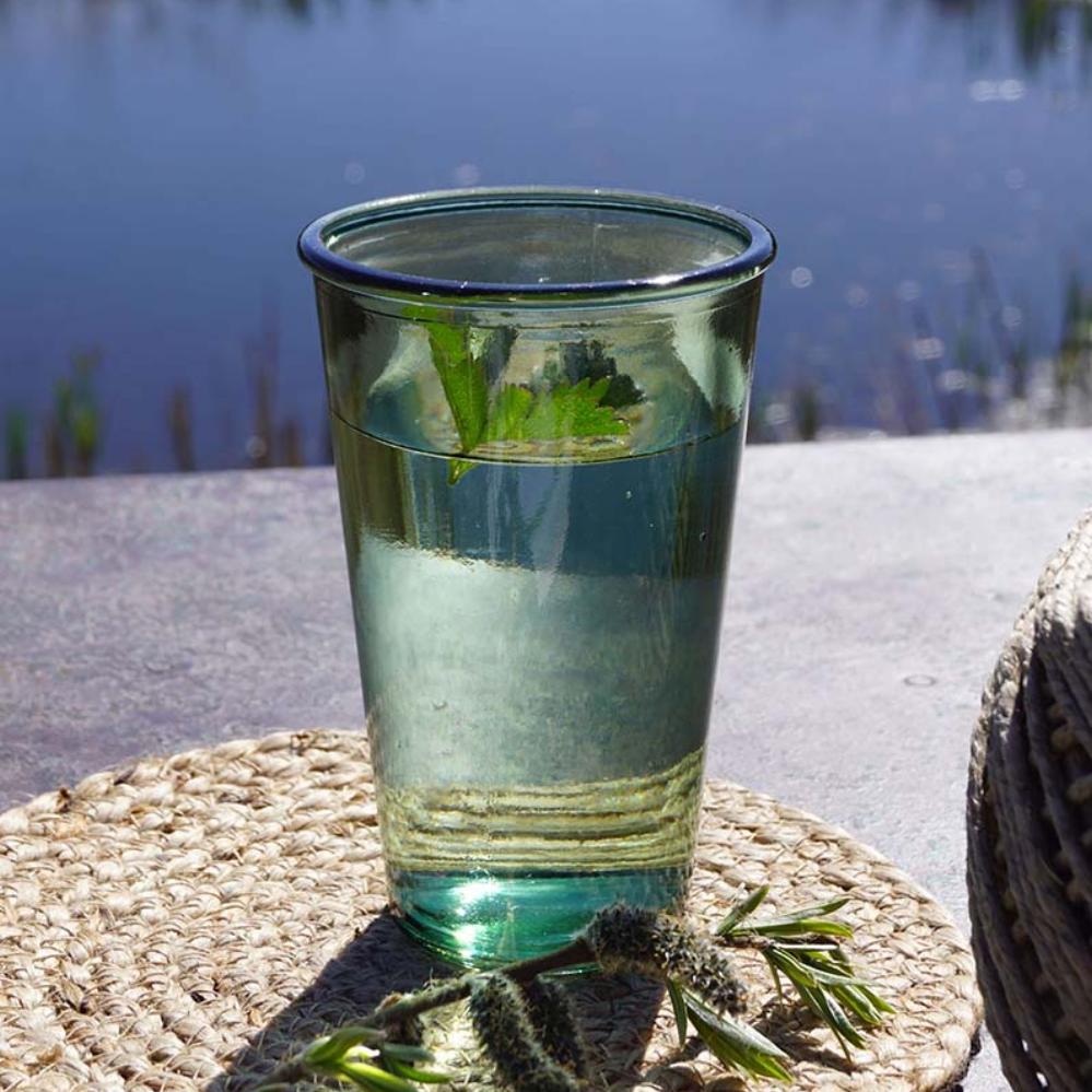 Et helt klassisk drikkeglas, bare med lidt mere kant. Glasset er lavet i svagt grønt genanvendt glas, og du vil kunne opleve små variationer i farve og struktur. Det giver et råt og levende udtryk, uden at det går ud over funktionaliteten. Glasset ligger godt i hånden og passer perfekt til både hverdag og servering i café eller restaurant. Brug det til vand, juice, cocktails – eller måske som en lille vase med et par blomsterstængler. Et praktisk valg med personlighed. Og så gør det sig ret godt i flok.