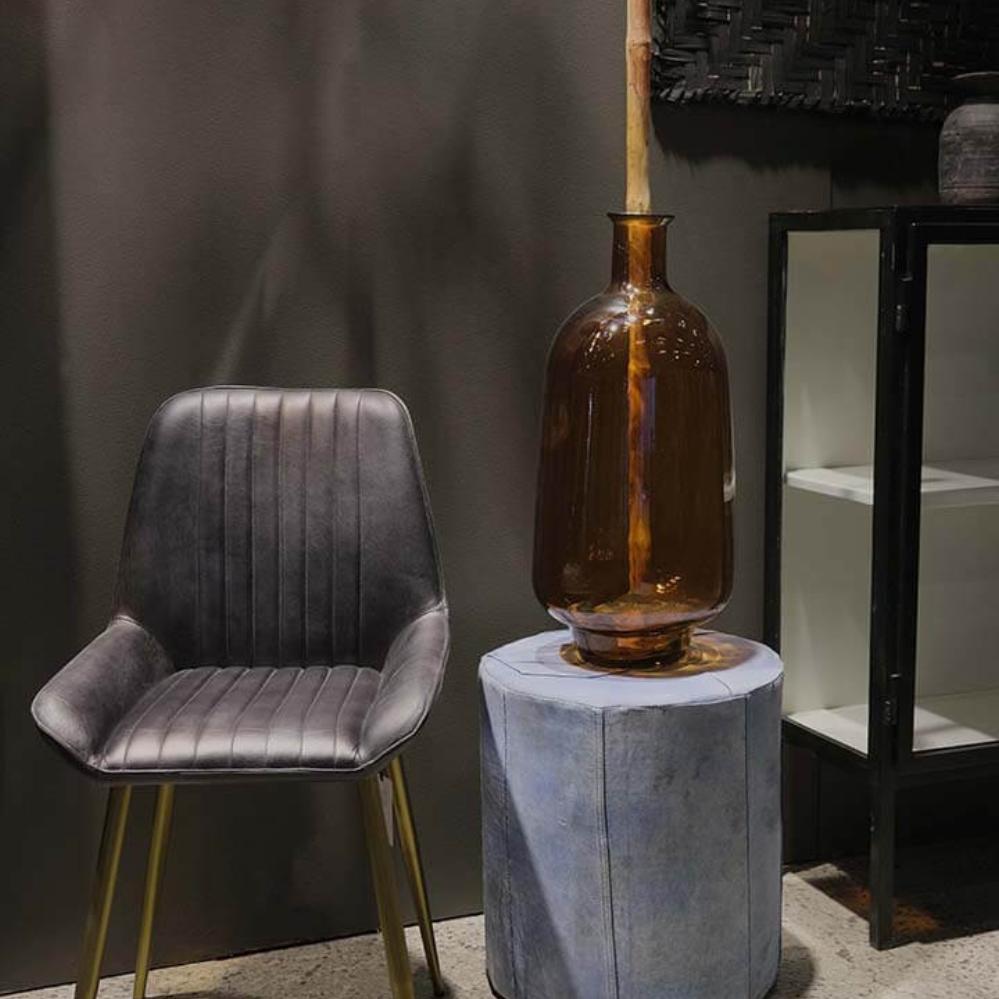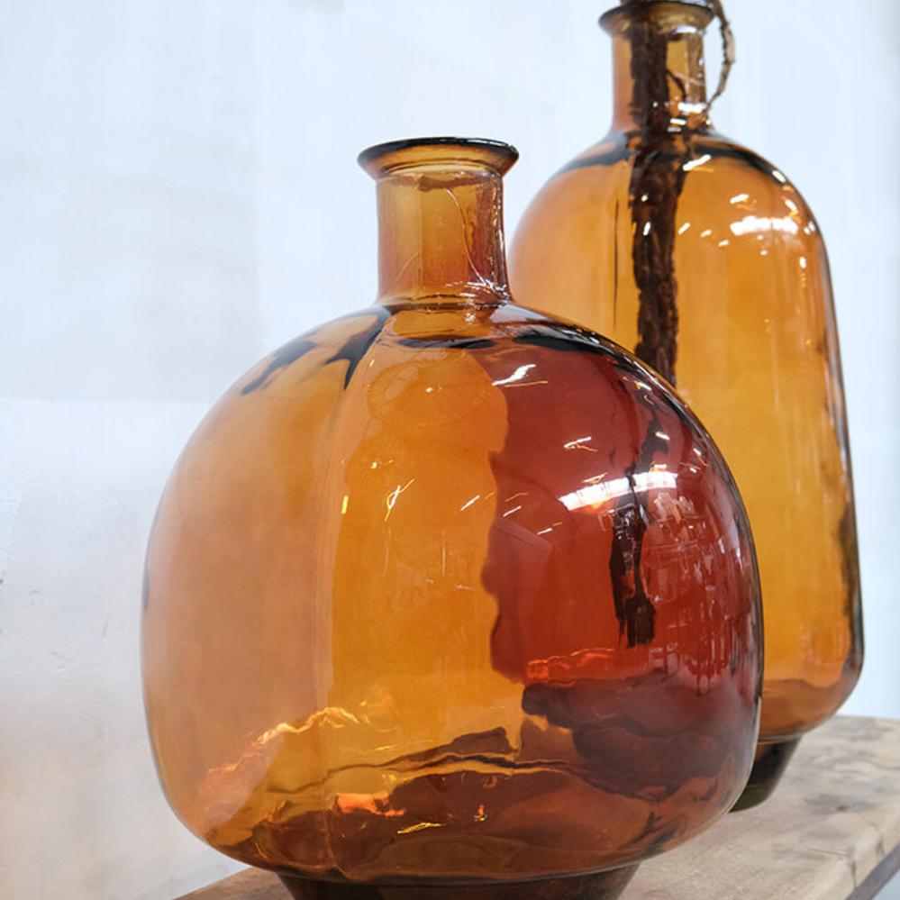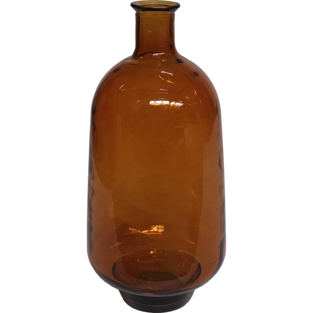 Her har du en stor smuk og flaskeformet gulvvase i en mørk ravfarvet nuance med en kunstnerisk balloneffekt. Den smukke gulvvase i glas er høj og slank, og kan enten stå alene eller sammen med andre vaser og krukker i andet materiale. Denne gulvvase på 60 cm er perfekt til årstidens grene eller tørrede blomster. Med en smuk gulvvase som denne kan du tilføre din indretning en sofistikeret og lækker stil. Vasen er lavet af genanvendt glas, og der kan derfor forekomme små bobler og mindre ujævnheder i glasset.