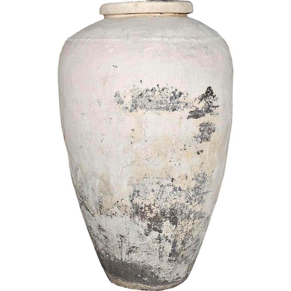 Denne kæmpestore, gamle lerkrukke har en imponerende størrelse og en virkelig fin og enkel patineret overflade. Krukken er dækket af en lys kalkagtig belægning, der med tiden har fået en naturlig slitage og antik charme, hvilket tilføjer et rustikt og autentisk udseende. Krukken har en klassisk form med en fin afrundet top med en enkel kant og udsmykninger i leret. Dens store volumen gør den velegnet som et dekorativt blikfang eller som en plantekrukke i større rum eller udendørs omgivelser. OBS! Krukken er ikke vandtæt eller frostsikret. Vi anbefaler derfor, at du laver et plastikindlæg.