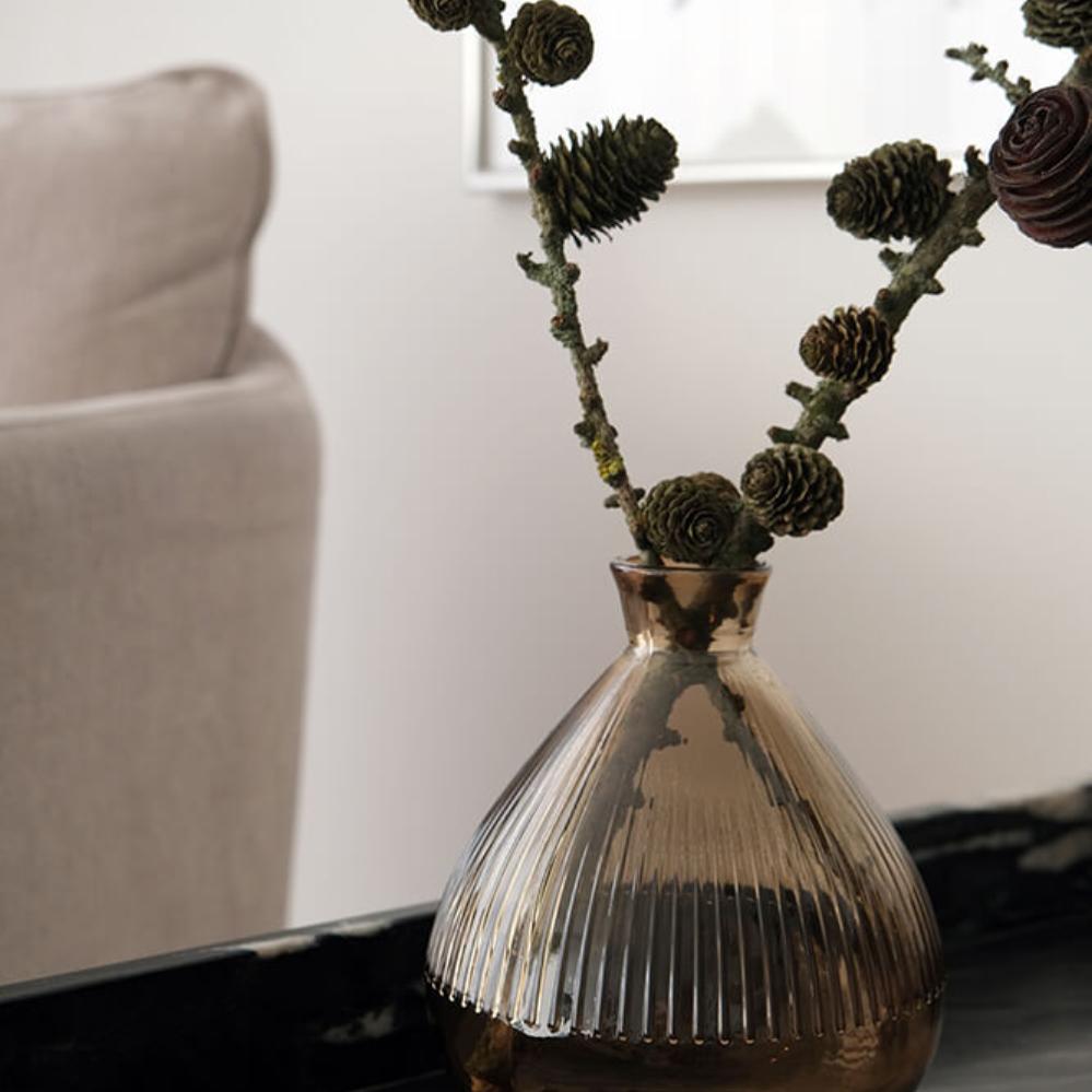 Keaton-vasen i den lyse mocca-farve er lavet af genanvendt glas og har en organisk, rund facon, der gør sig godt både med og uden indhold. Det riflede glas spiller smukt med lyset og giver vasen et levende udtryk. Den varme nuance passer til både tørrede grene og grønne kviste, og vasen er nem at kombinere med Aniston og juletræet i samme glasserie, hvis du vil skabe ro og sammenhæng i din dekoration.