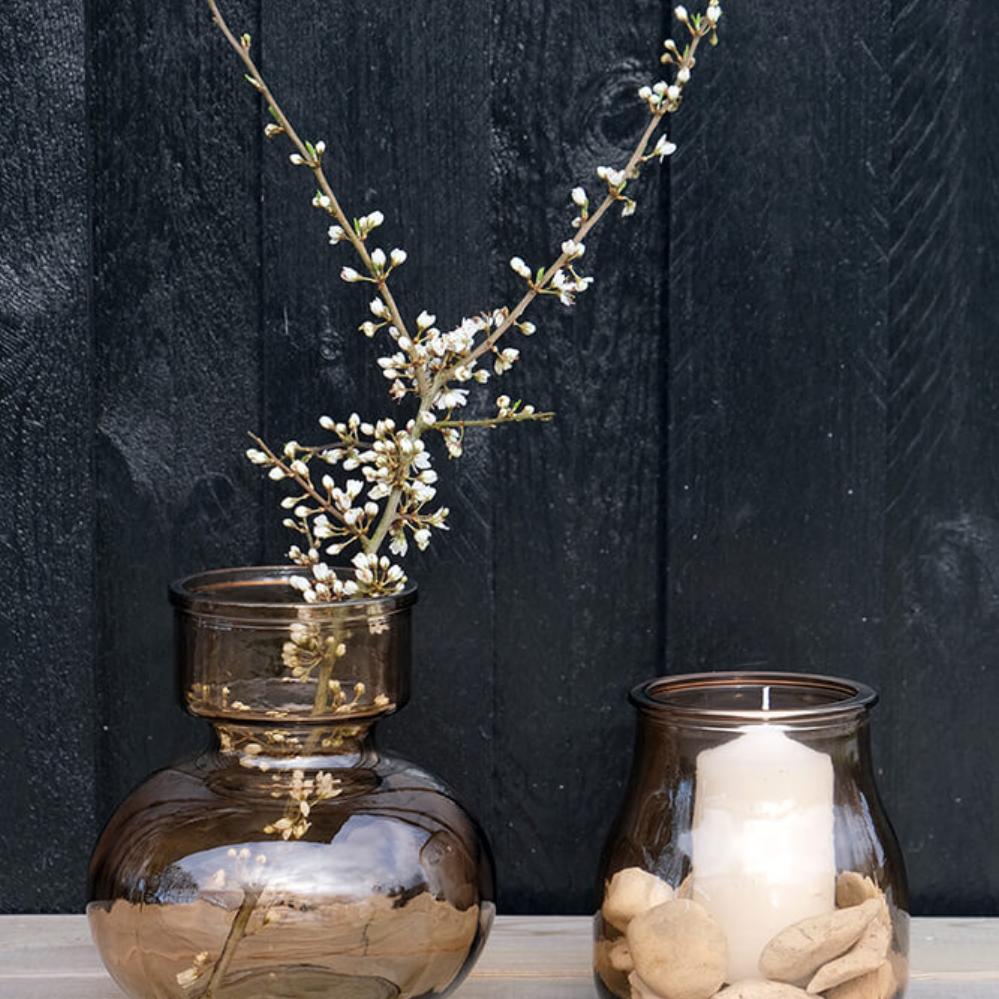 En smuk og enkel lille vase, der både fungerer som lysestage og blomsterholder. Lawrence-vasen er lavet af genbrugsglas, hvilket giver den et karakterfuldt udtryk med små variationer i strukturen. Den røgfarvede version er sofistikeret farve, der bringer stil i alle rum. Den er lige så fin med et tændt bloklys som med en enkelt stilk eller en lille buket – et tidløst element, der skaber ro og hygge i hjemmet.