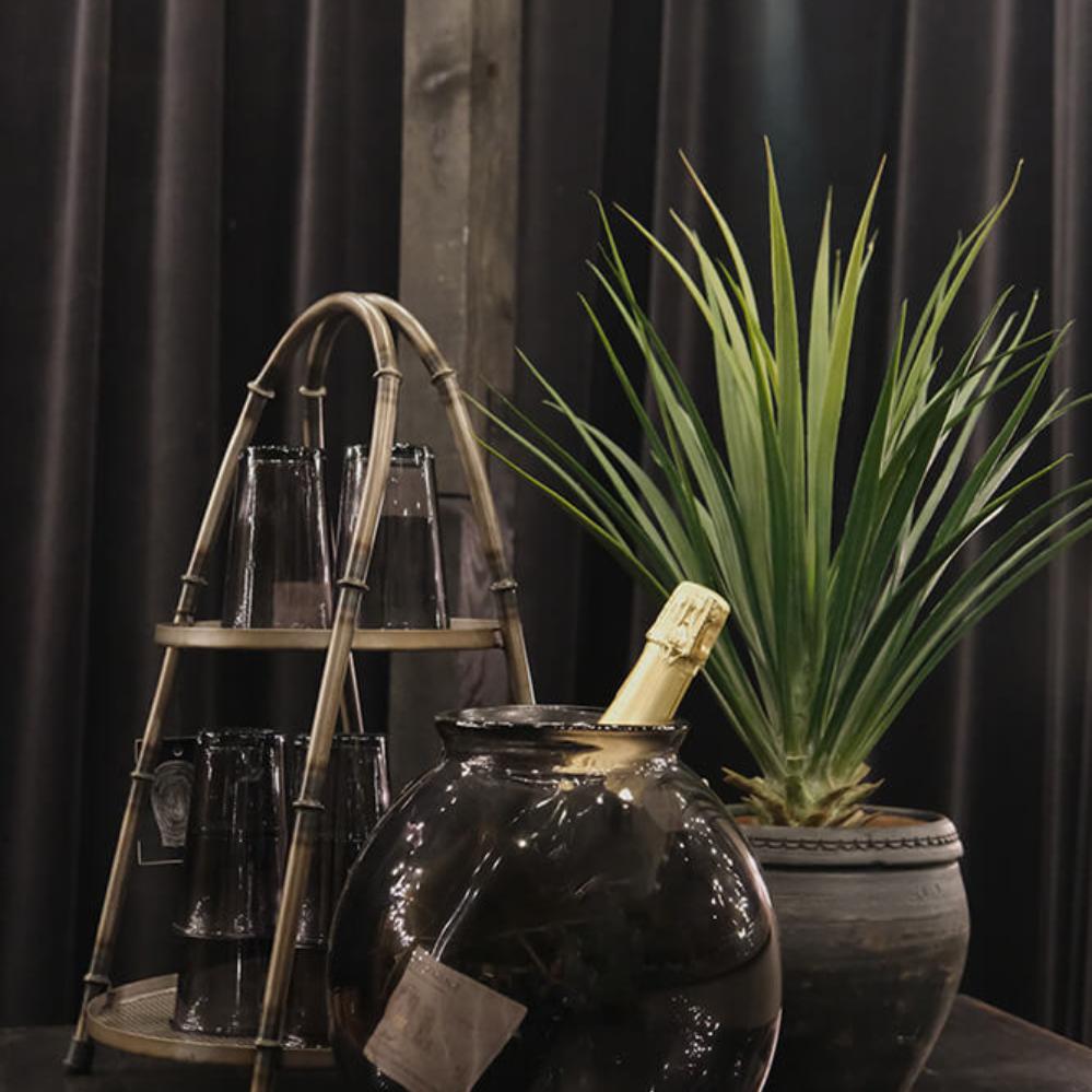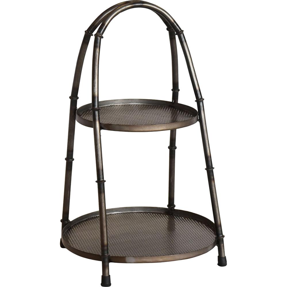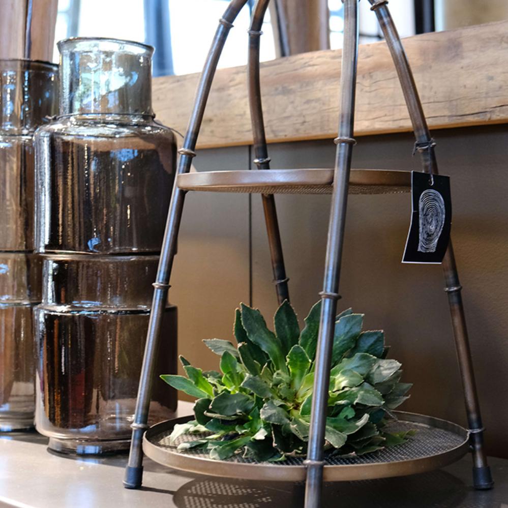 Denne elegante etagere er fremstillet i jern og har to tallerkner i perforeret jern med en lille kant. Bakkeopsatsen kan f.eks. bruges til den lille overraskelse. En morgenmadsbakke hvis du vil forkæle dine kære med morgenmad på sengen. Som display til hotellets og restaurantens buffetbord. Stil etageren i dit orangeri og dekorer den med smukke planter og blomster. Med denne dekorative opsats har du mange muligheder. Kun fantasien sætter grænser.