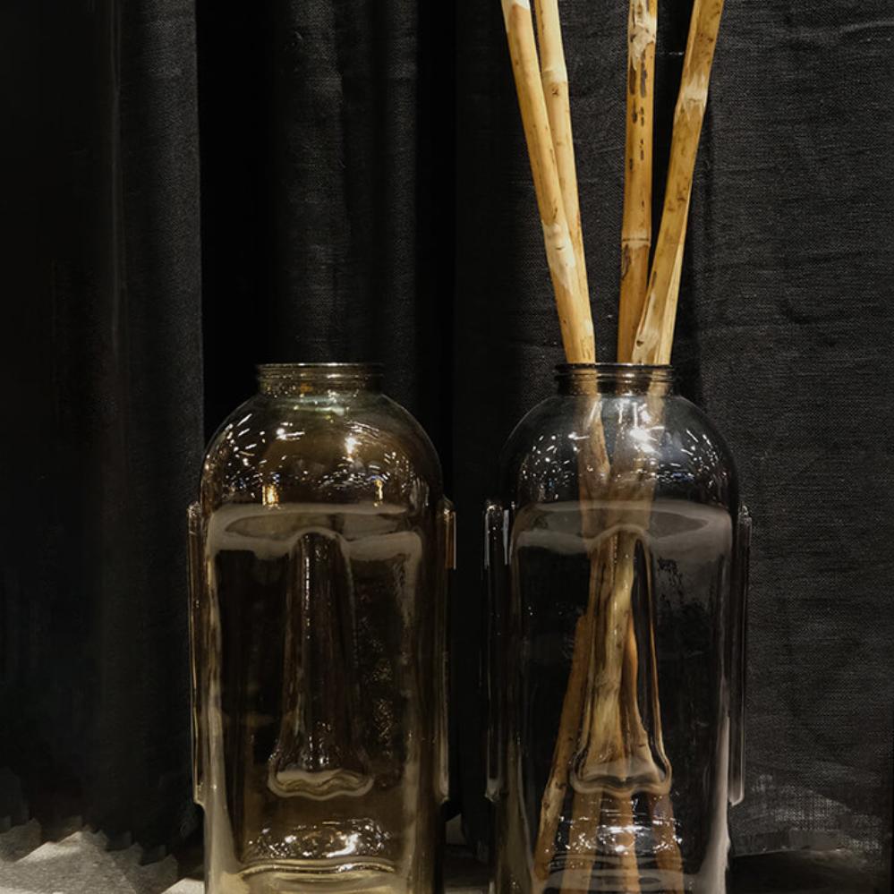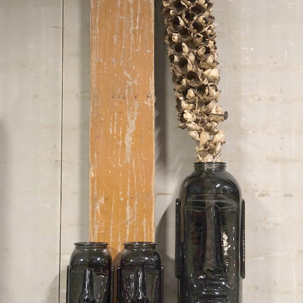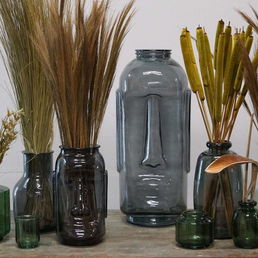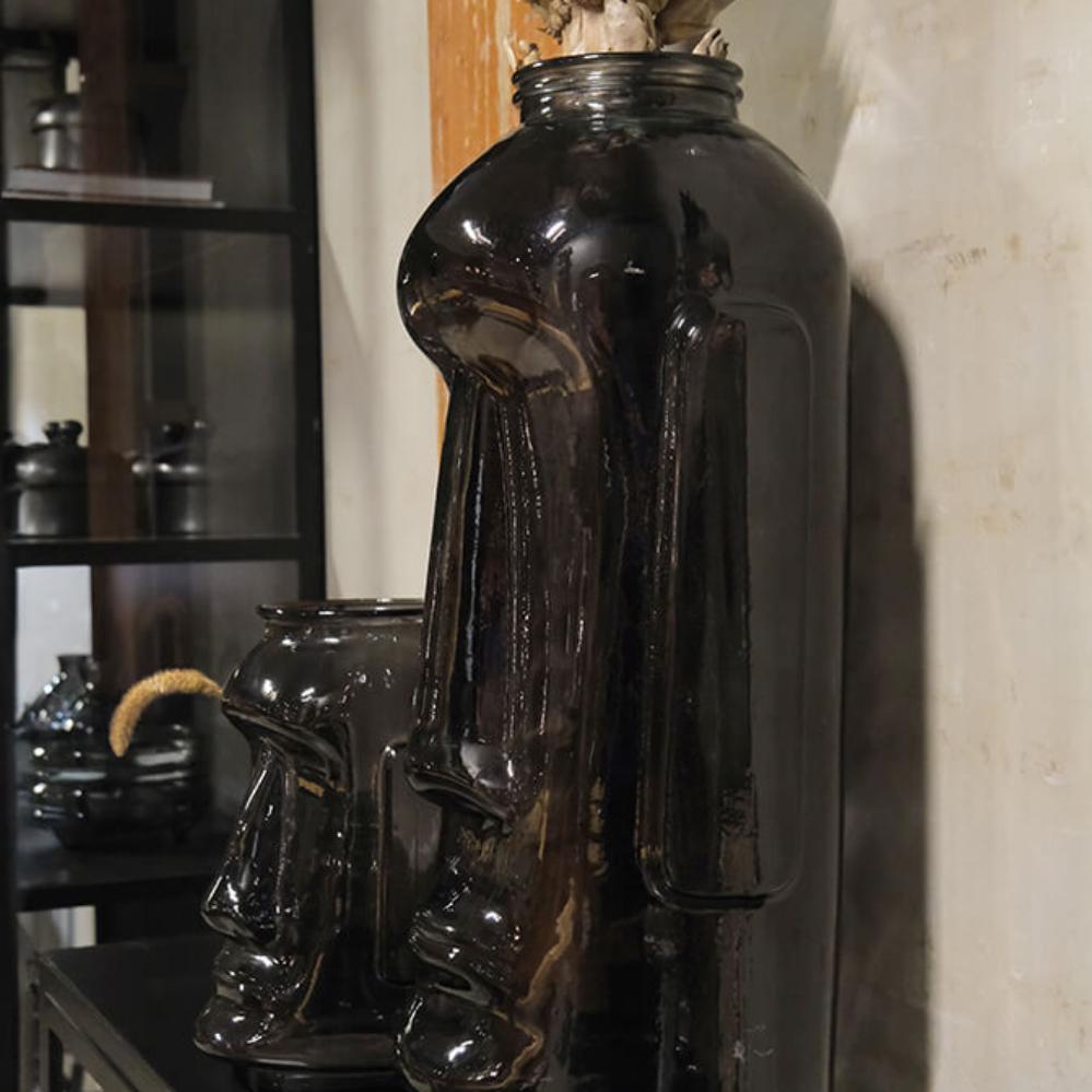 Stor glasvase med et anderledes og spændende design i form af et ansigt. Glasvasen er utrolig fin både når der står friske blomster/grene i, et stort bloklys, men den pynter også i sig selv. Glasvasen vil helt sikkert tilføje ekstra kant til indretningen. Vasen er lavet af genanvendt glas, og der kan derfor forekomme små bobler og mindre ujævnheder i glasset.