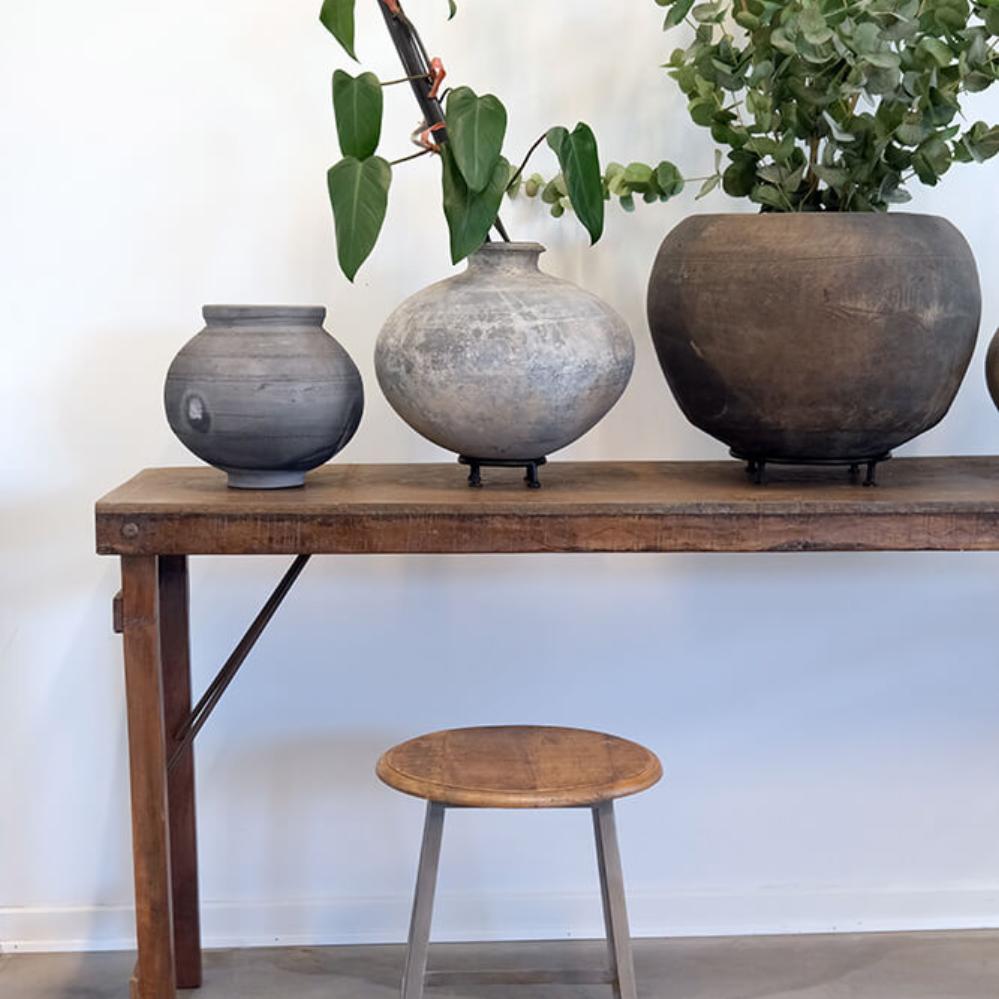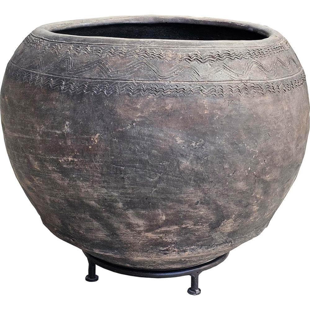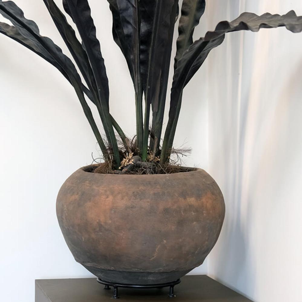Disse smukke, håndlavede lerkrukker oser af historie og autenticitet. De stammer fra Sydindien og er kendetegnet ved deres rustikke mørke patina samt de dekorative mønstre, der på fineste vis pryder krukkens øverste kant. Krukkerne har en rund bund, hvilket giver dem et unikt udtryk, men også kræver en stabil base. Derfor medfølger en robust jernfod, der sikrer, at krukken står solidt og stilfuldt – uanset om den bruges som dekoration i en restaurant, butik eller i et privat hjem. Brug den som en dekorativ gulvkrukke, en plantekrukke med tørrede grene eller som et statement-piece i en industriel eller rustik indretning. Hver krukke er unik i sin form og finish, hvilket understreger dens ægte vintage charme.