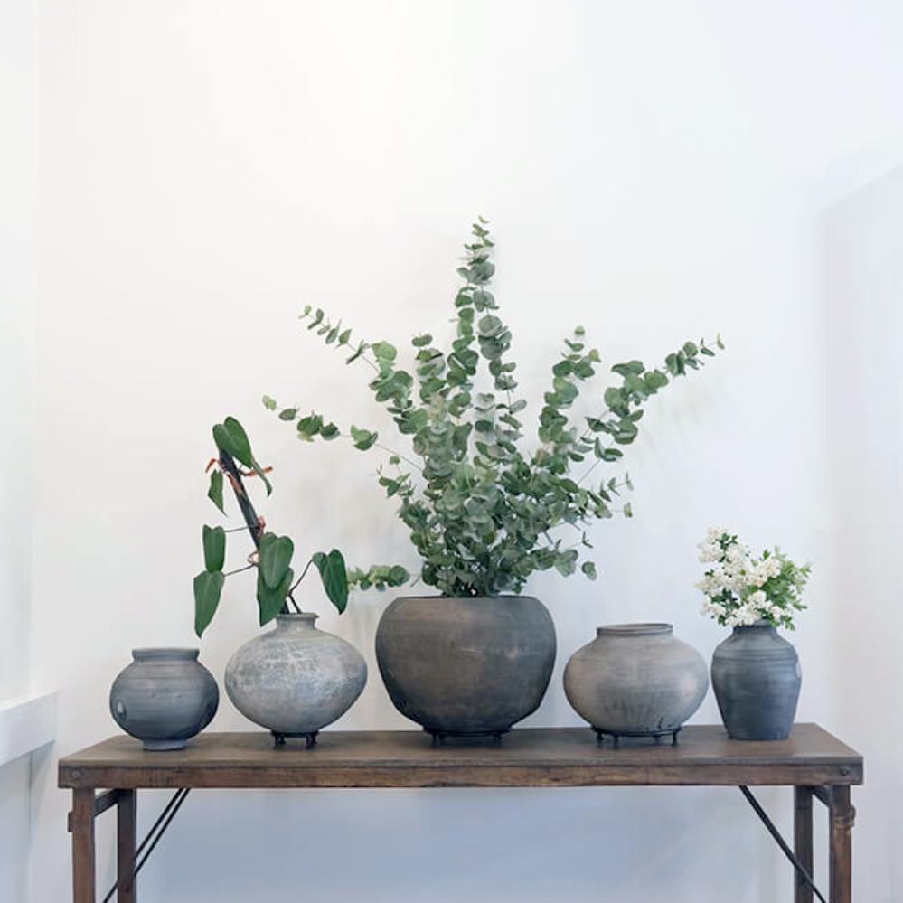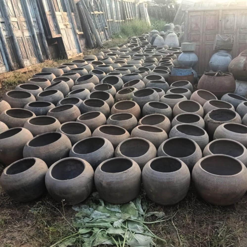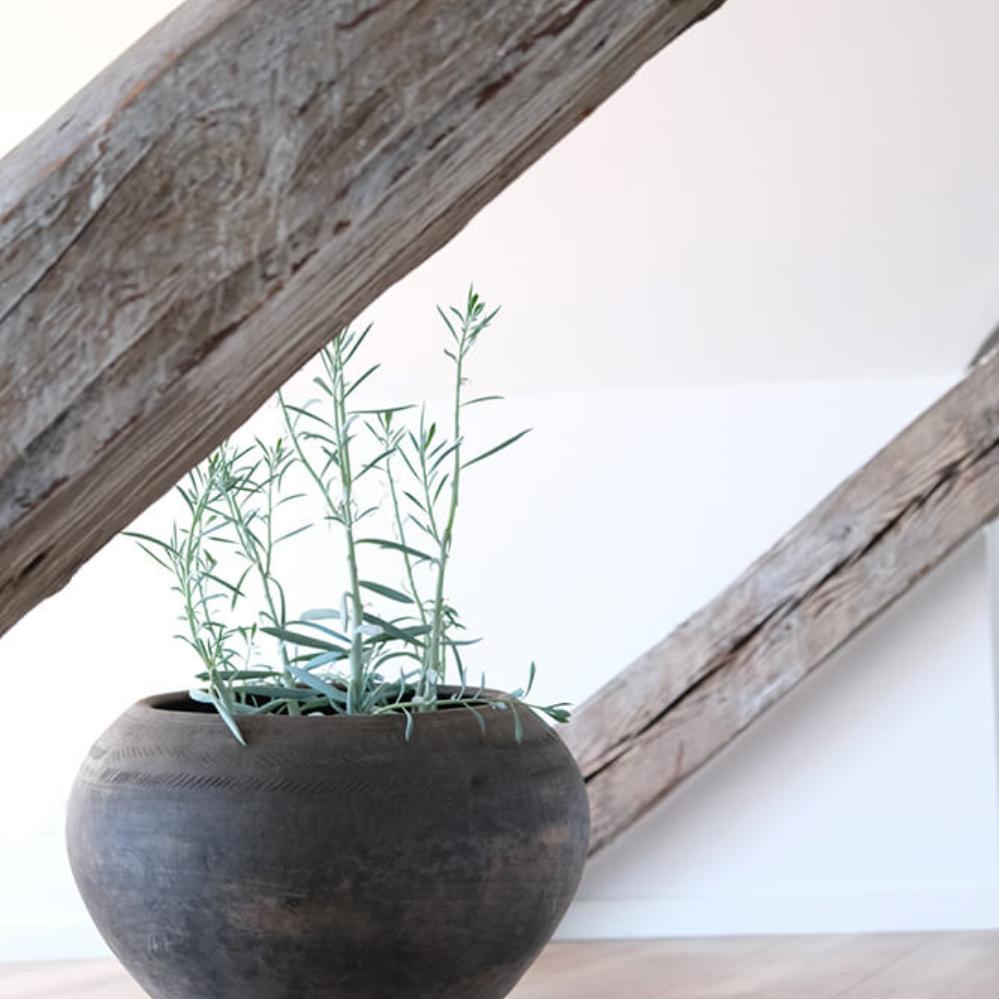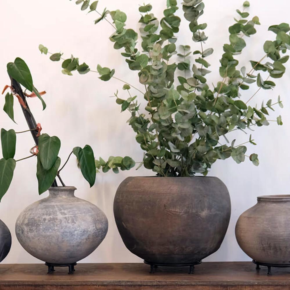 Disse smukke, håndlavede lerkrukker oser af historie og autenticitet. De stammer fra Sydindien og er kendetegnet ved deres rustikke mørke patina samt de dekorative mønstre, der på fineste vis pryder krukkens øverste kant. Krukkerne har en rund bund, hvilket giver dem et unikt udtryk, men også kræver en stabil base. Derfor medfølger en robust jernfod, der sikrer, at krukken står solidt og stilfuldt – uanset om den bruges som dekoration i en restaurant, butik eller i et privat hjem. Brug den som en dekorativ gulvkrukke, en plantekrukke med tørrede grene eller som et statement-piece i en industriel eller rustik indretning. Hver krukke er unik i sin form og finish, hvilket understreger dens ægte vintage charme.