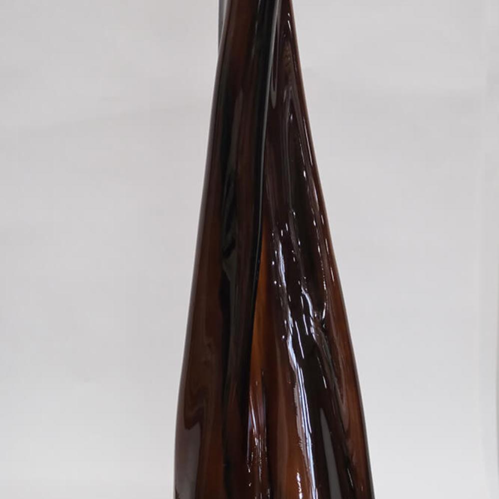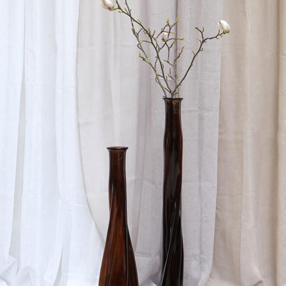 En høj og smuk sag med masser af kant. Den chokoladebrune 1 meter høje Paltrow gulvvase er lavet af genanvendt glas og stråler af karakter med sin snoede silhuet og mørke tone. Hver vase er delvist hånddrejet, og derfor får du ikke bare en vase, men et stykke håndværk med små variationer og skæv charme. Derfor kan vasen også afvige i snoningen fra billedet. Vasen er et markant statement-piece i både det private hjem og i erhvervsindretningen. Brug den alene som skulpturel dekoration i en hotel-lounge, i hjørnet af en restaurant eller i et showroom, eller skab en wow-effekt ved at matche vasen med en eller flere af de andre vaser i samme serie, hvor de virkelig får lov at fylde. (Søg efter Paltrow). Den passer også perfekt til et par tørrede grene eller lange pampasstrå.