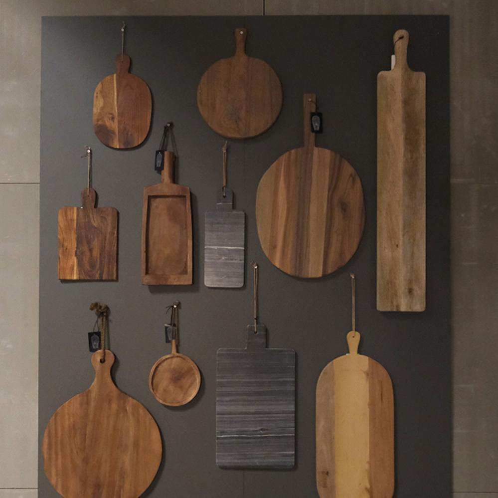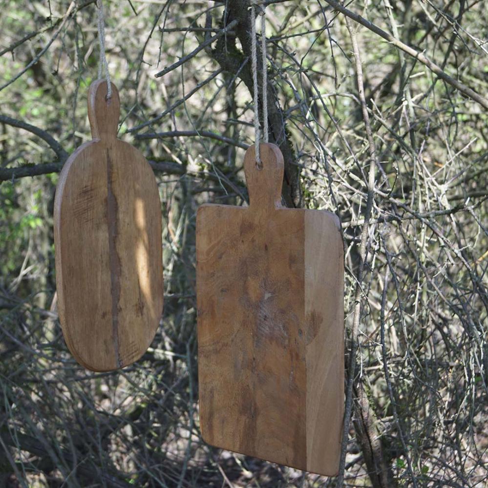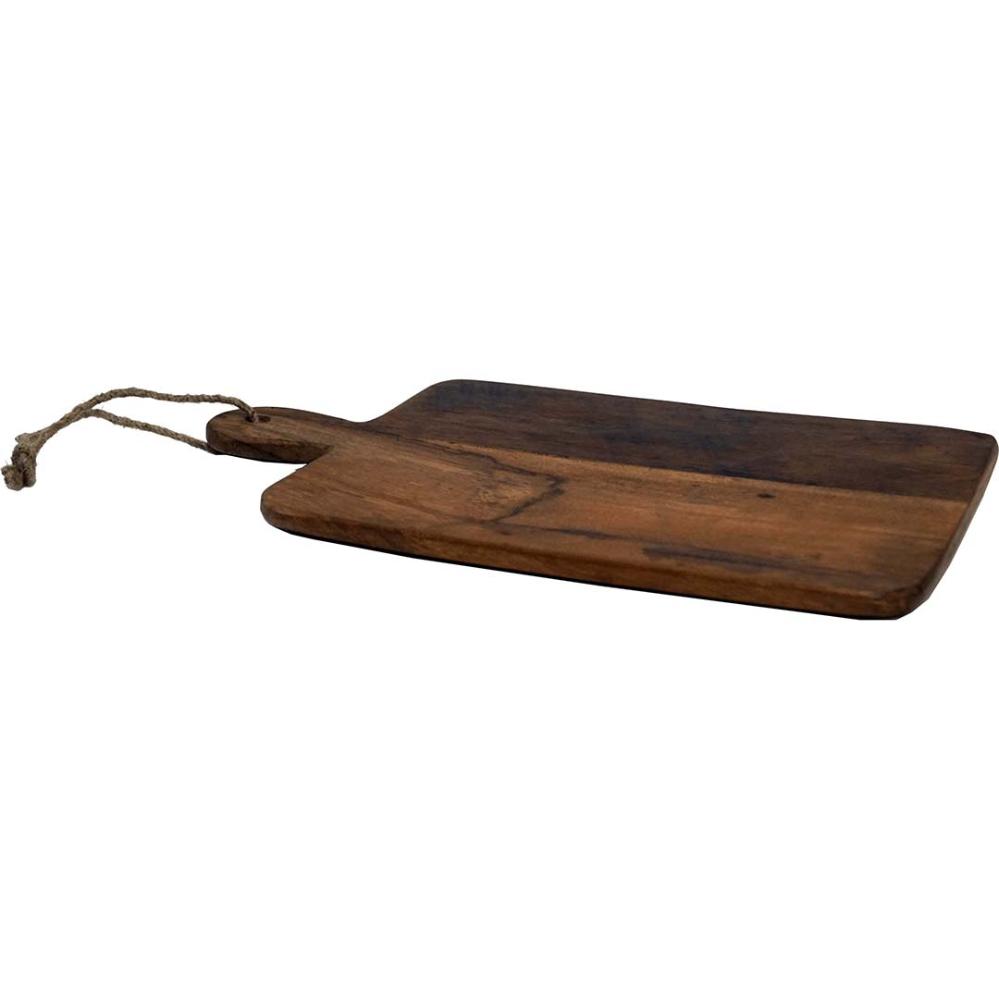 Rustikt aflangt skærebræt med håndtag samt snor til ophæng. Skærebrættet er i træ med skønne mørke farve nuancer. Brug skærebrættet både til tilberedning og servering af ost, frugt, tapas osv. Brug vand og sæbe til rengøringen, og forlæng holdbarheden ved at smøre brættet med vegetabilsk olie. Opvaskemaskine anbefales ikke.