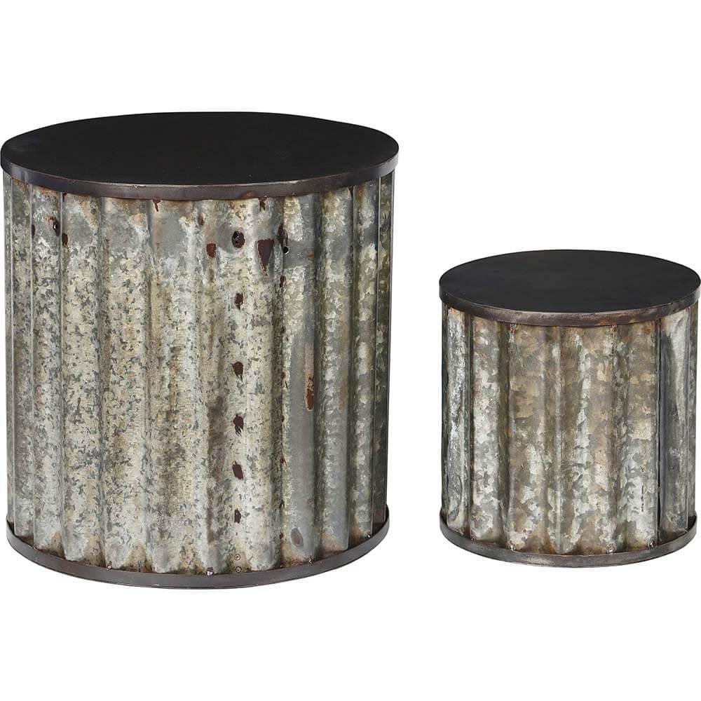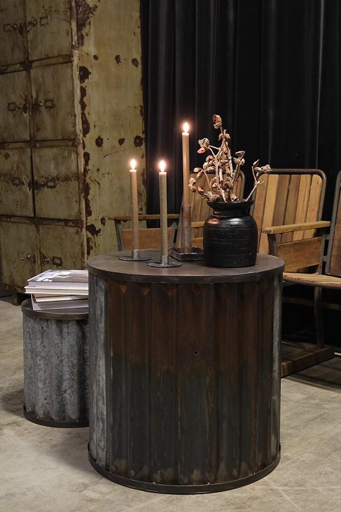 Dette sofabordssæt er et perfekt valg for dig, der elsker det rå og industrielle look. Bordene er fremstillet af metal med en rustik patina, der giver dem masser af kant og karakter. Den bølgede metalkonstruktion kombineret med den runde bordplade skaber en fed kontrast mellem det hårde og det bløde, hvilket gør sættet til en ægte blikfang i indretningen. Brug dem som sofaborde i din lounge, som sideborde i en café eller måske som et cool display i din butik. De fungerer både sammen som et sæt eller hver for sig – og så bidrager de med en autentisk, industriel stemning, der aldrig går af mode. Det lille sofabord måler: H:40 x Ø:40 cm TIP: Du kan også med fordel vælge at bruge bordene som krukker, da de kan vendes.