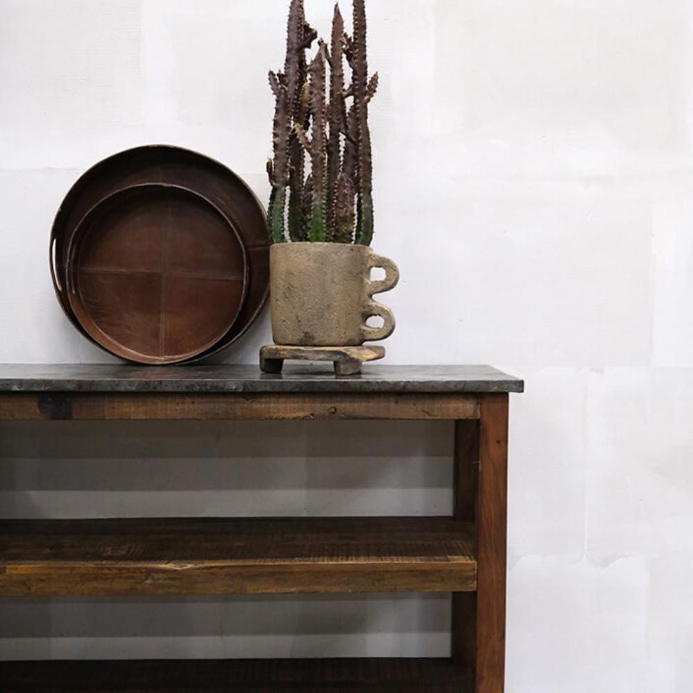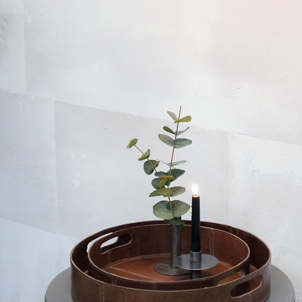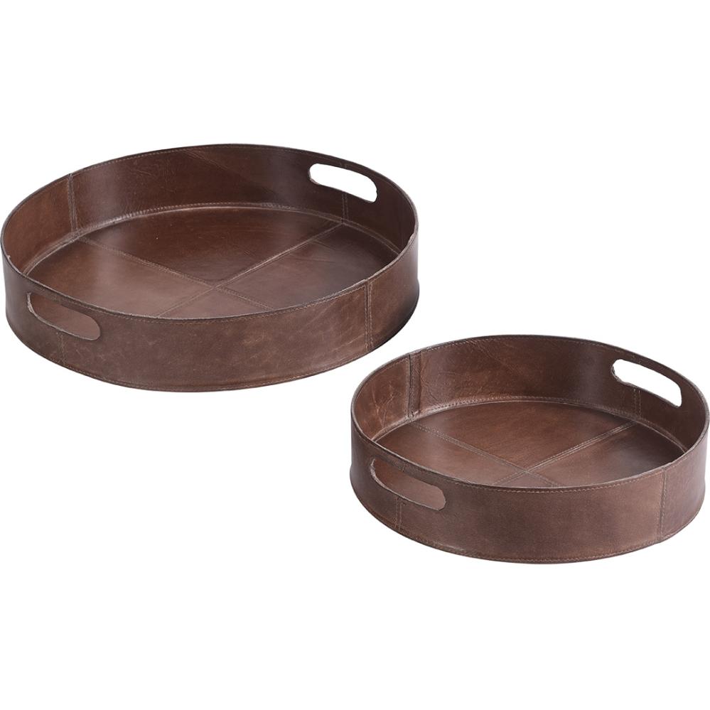 Utrolig flot rundt bakkesæt i læder. Serveringbakkerne har høj kant og to hanke. Kan også bruges som pyntebakker til ting du gerne vil udstille eller forskelligt nips. Sættet består af 2 stk. (Ø 44 cm + Ø 36 cm).