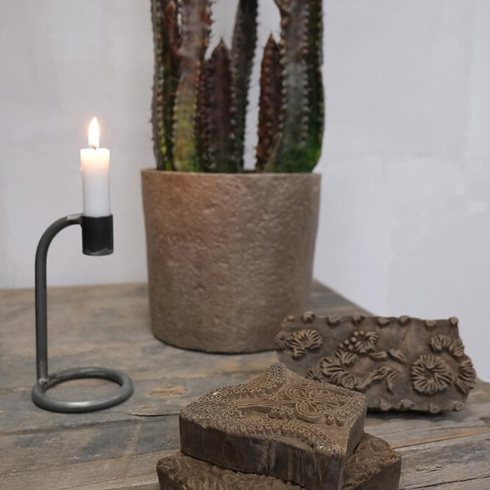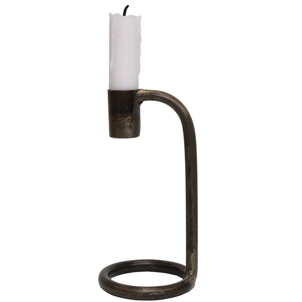 Smuk og enkel lysestage i jern med en højde på 16 cm. Den har et stilrent, industrielt design med rund fod og buet form, der giver et let og moderne udtryk. Stagen passer perfekt til et kronelys og kan bruges alene som et enkelt statement eller sammen med andre lysestager for at skabe en varm og hyggelig stemning i indretningen.