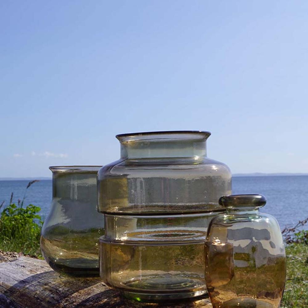 Flot røgfarvet glasvase i genanvendt glas til alt fra duftende yndlingsblomster til pyntende grene. Du kan også sagtens bruge den blot som et dekorativt element i din bolig alene eller med en rå lysestage. Eller gå all in og match den med flere vaser i samme farvenuance, med tørrede eller levende blomster. Vasen er lavet af genanvendt glas, og der kan derfor forekomme små bobler og mindre ujævnheder i glasset.