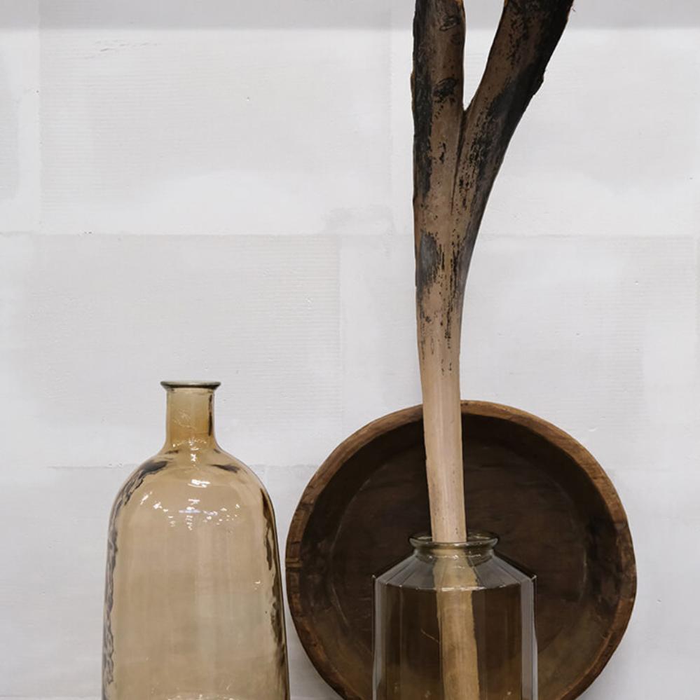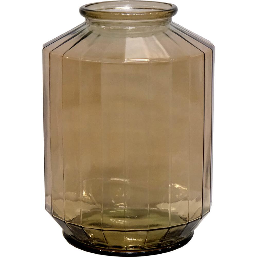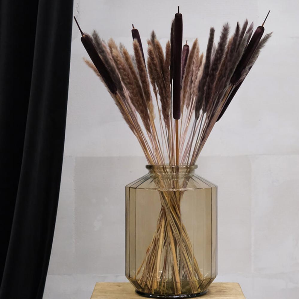 Vi er vilde med denne smukke røgfarvede vase i et elegant kantet design. Du kan pynte den med både friske blomster, grene fra naturen eller tørrede blomster. Glasvasen kan også bruges til et stort bloklys. Vasen er 35 cm høj og kan derfor både bruges som gulvvase eller bordvase. Med denne skønne glasvase kan du nemt bringe lidt luksus ind i din indretning. Vaserne er fine hver for sig, som sæt eller mixet med andre former, størrelser og materialer. Glasvasen er fremstillet af genanvendt glas, og der kan derfor forekomme små bobler og mindre ujævnheder i glasset.