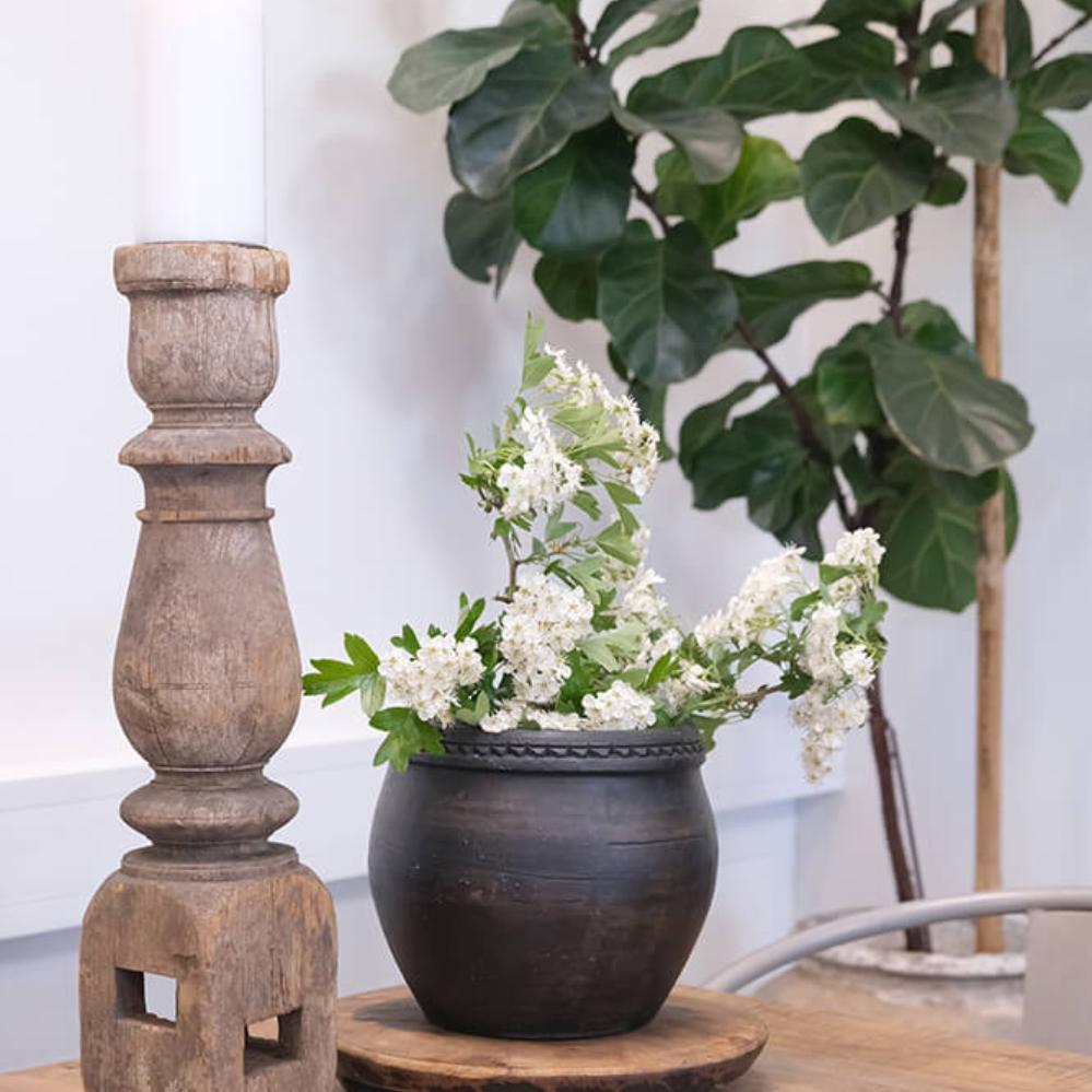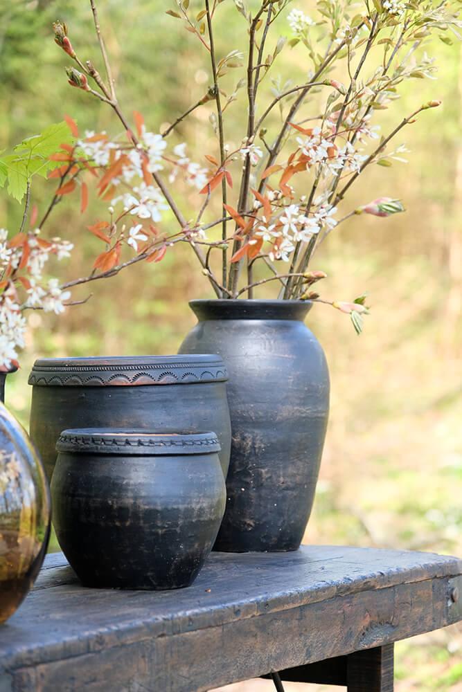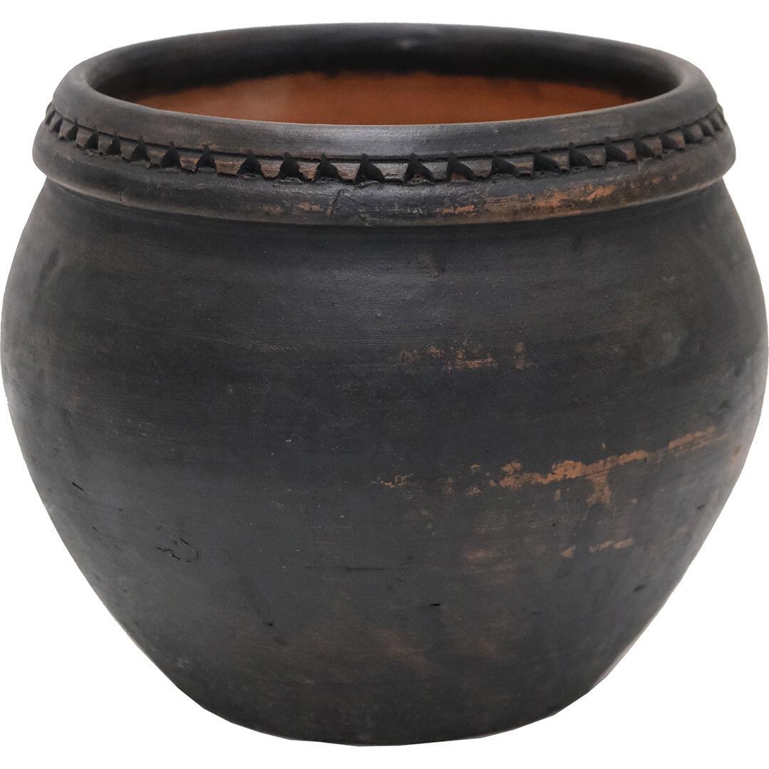 Flot, håndlavet lerkrukke. Denne lerkrukke har en skøn, mørk overflade med patina, som giver krukken et næsten græsk-romersk look. Krukken har charme nok til at stå for sig selv, men den kan også bruges som potteskjuler.