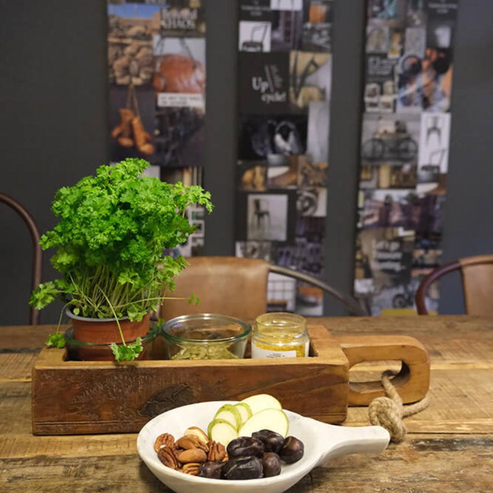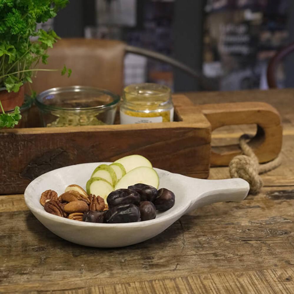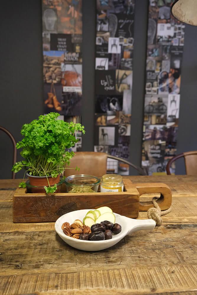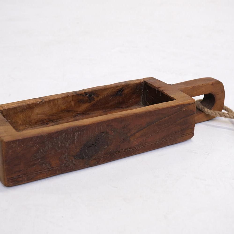 Rustikke, håndlavede træfade af genanvendt træ. Hvert fad bærer præg af det genanvendte træs varierende udtryk og håndværkerens individuelle touch. Alle træfadene har håndtag med reb, så de kan hænges i en krog for praktisk opbevaring. Træfadene er flotte i sig selv, når de f.eks. står på dit sofabord, men kan naturligvis også bruges til opbevaring eller til en dekoration.