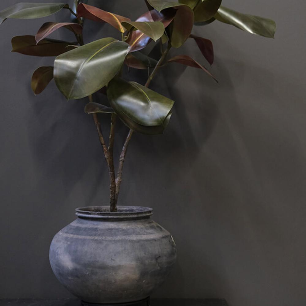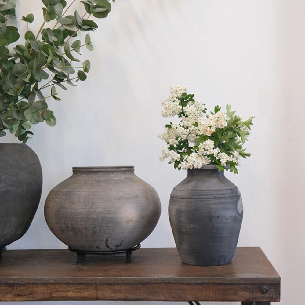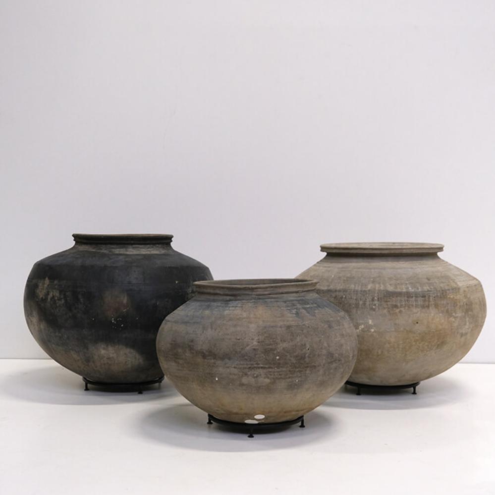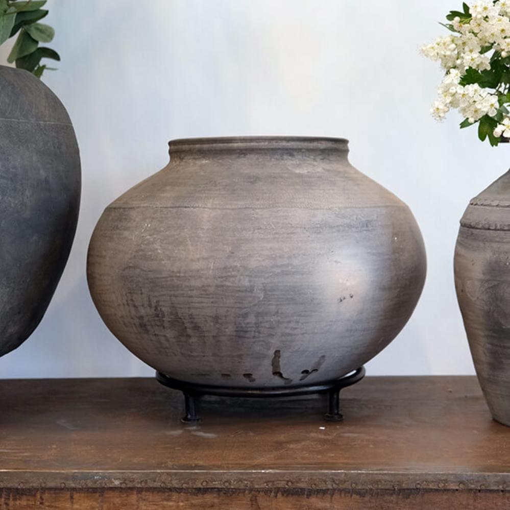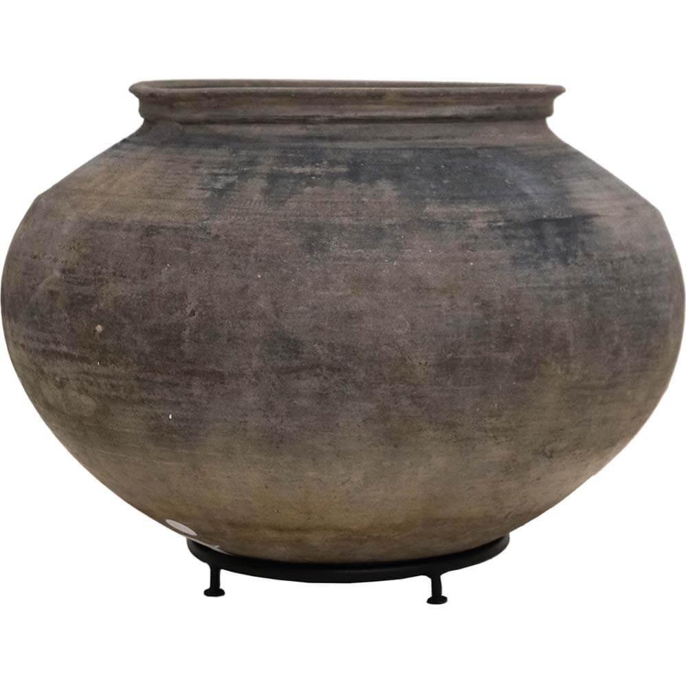 Denne unika lerkrukke på løs jernfod er helt fantastisk. Krukken har en smuk enkelt form og er et skønt blikfang at have stående i dit hjem eller din business. Krukkerne er meget forskellige i størrelser, farvetone og finish og de kan være med små revner og skår. Krukken er gammel og håndlavet derfor anbefaler vi, at såfremt du sætter planter eller blomster i den, skal du fore krukken med kraftig plastik eller stille en glasindsats i bunden.